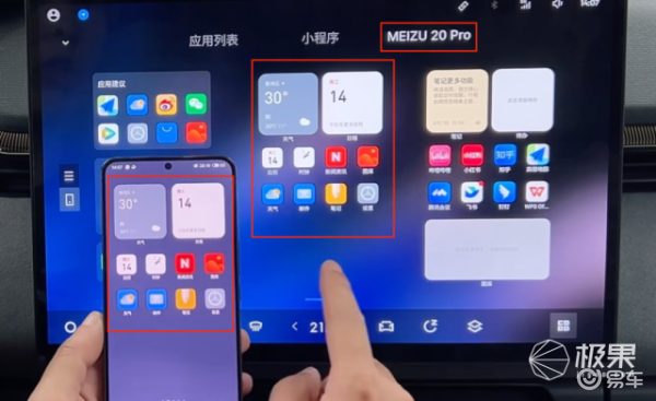 在日常使用中,你可以在车机上使用手机上的APP,包括抖音、微信、飞书等等,甚至连APP的排布方式都和手机上一样,这些应用都能通过在手机端进行运算,然后实时的在中控屏上进行使用。比如车上的麦克风,摄像头和音响等等都能进行调用,当然,手机上的摄像头画面也可以实时的显示在车机上,这种流转的表现确实让人很惊艳。