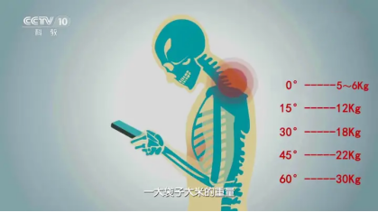 低头15°时就相当于脖子上挂了一个大西瓜,很多人看电子产品时习惯低头30°,相当于挂两个大西瓜。