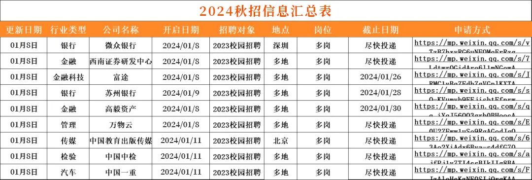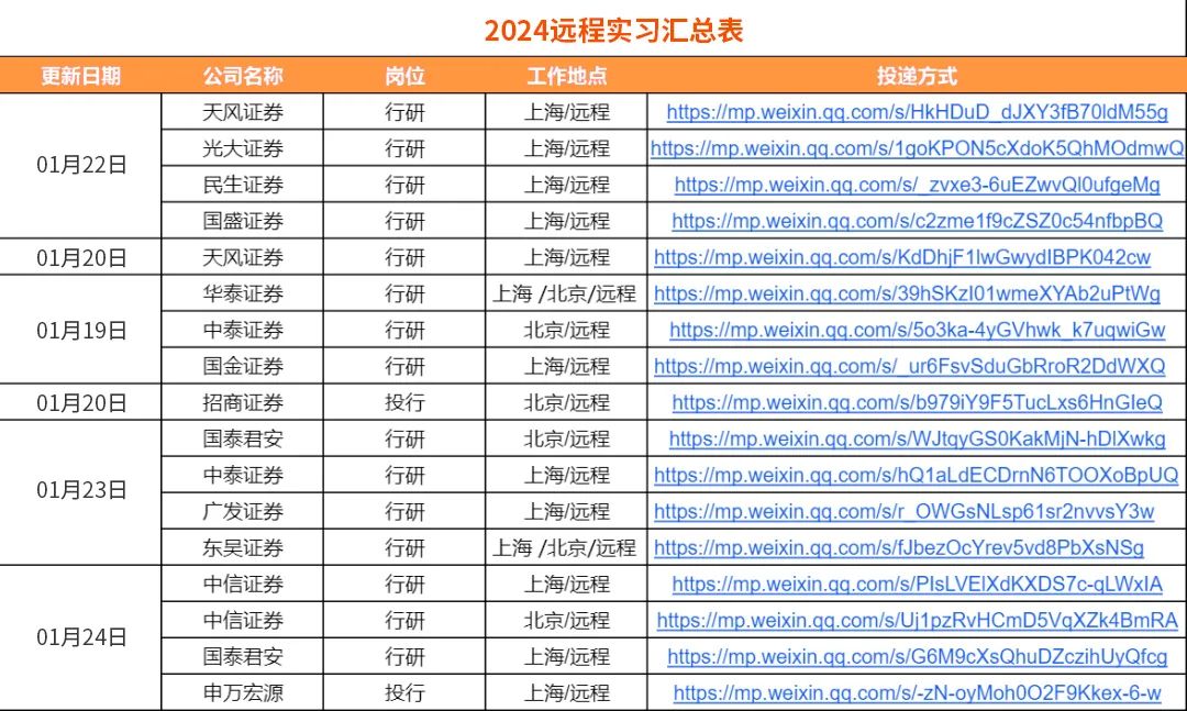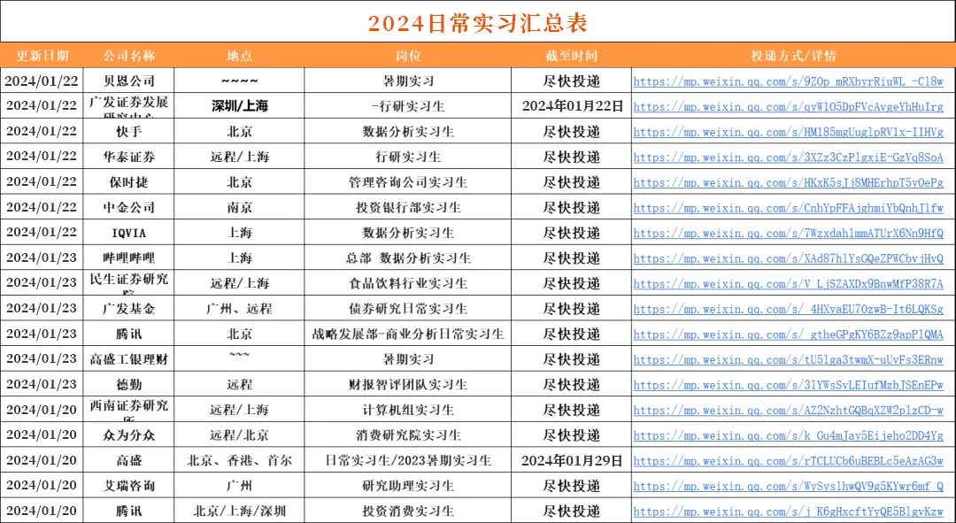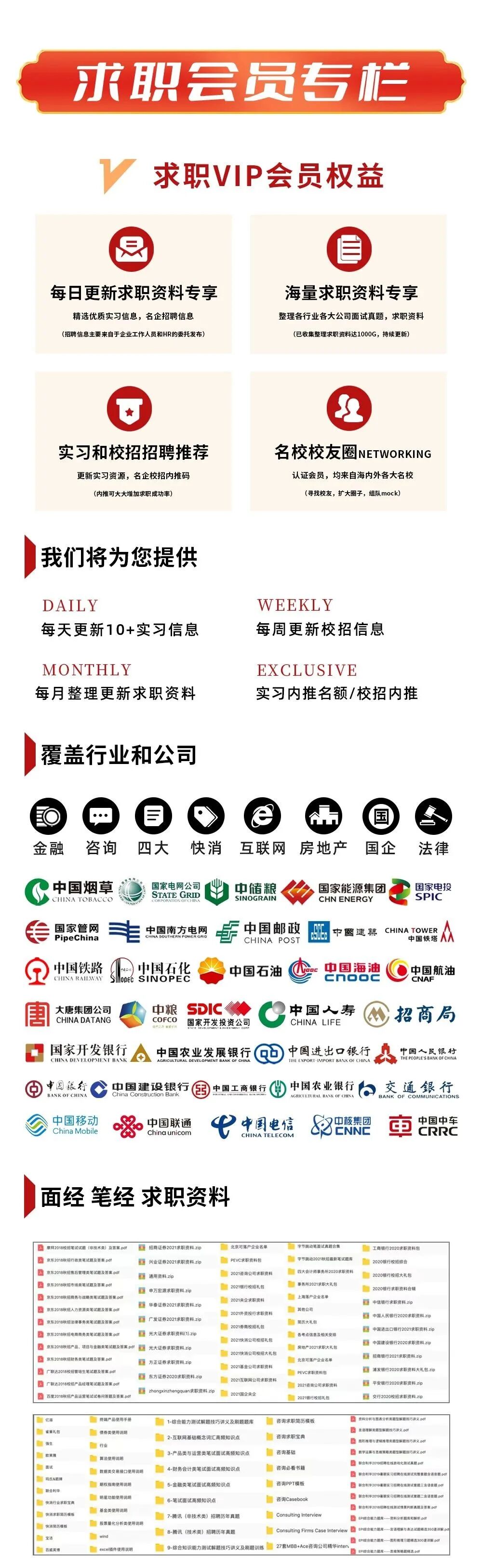 2.每周:我们会定期整理,寒暑假实习信息汇总表、远程实习信息汇总表、春招/秋招网申汇总表、国家部委招聘信息等等,每周第一时间分享到VIP会员群!部分展示如下??