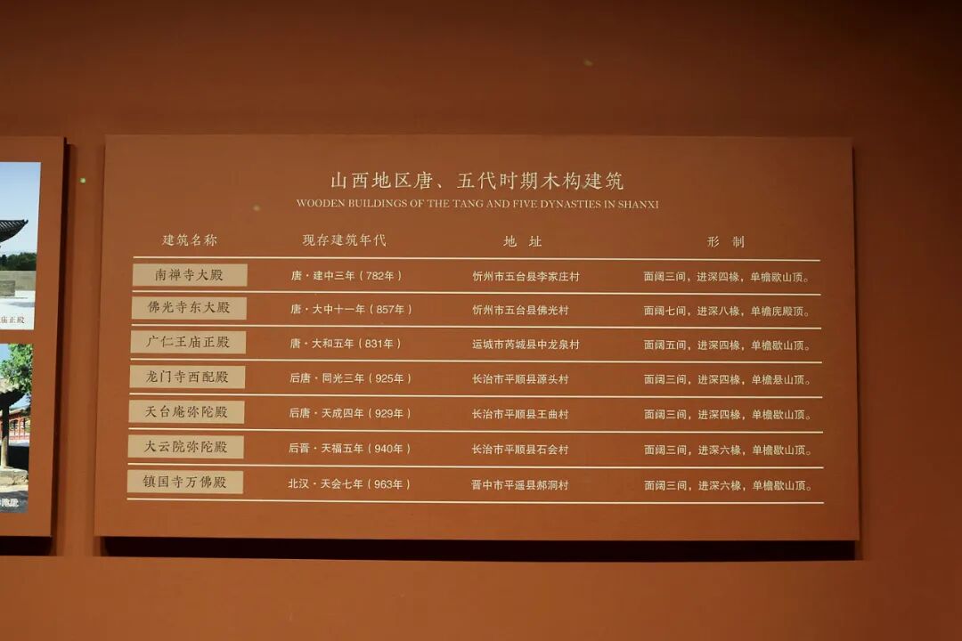 山西博物院第三次全国文物普查的时候,山西登录的不可移动文物53875处,其中古建筑就有28027处,占全国52%。全国重点文物保护单位531处,居全国第一;其中古建筑420处,占比79%,排名全国第一。山西现有元代以前木结构古建筑遗存495座,约占全国580座的85% ;宋辽金之前的木结构古建全国183座,山西有150个,约占全国的82%;元代的木结构建筑全国389个,山西338个,约占全国的87%,全国仅存的3座完整的唐代木结构建筑,全在山西。分别是:芮城县广仁王庙正殿(唐大和五年,公元831年,道教);还有一种说法是4座唐建,包括平顺县天台庵(唐末天佑四年,公元907年)。