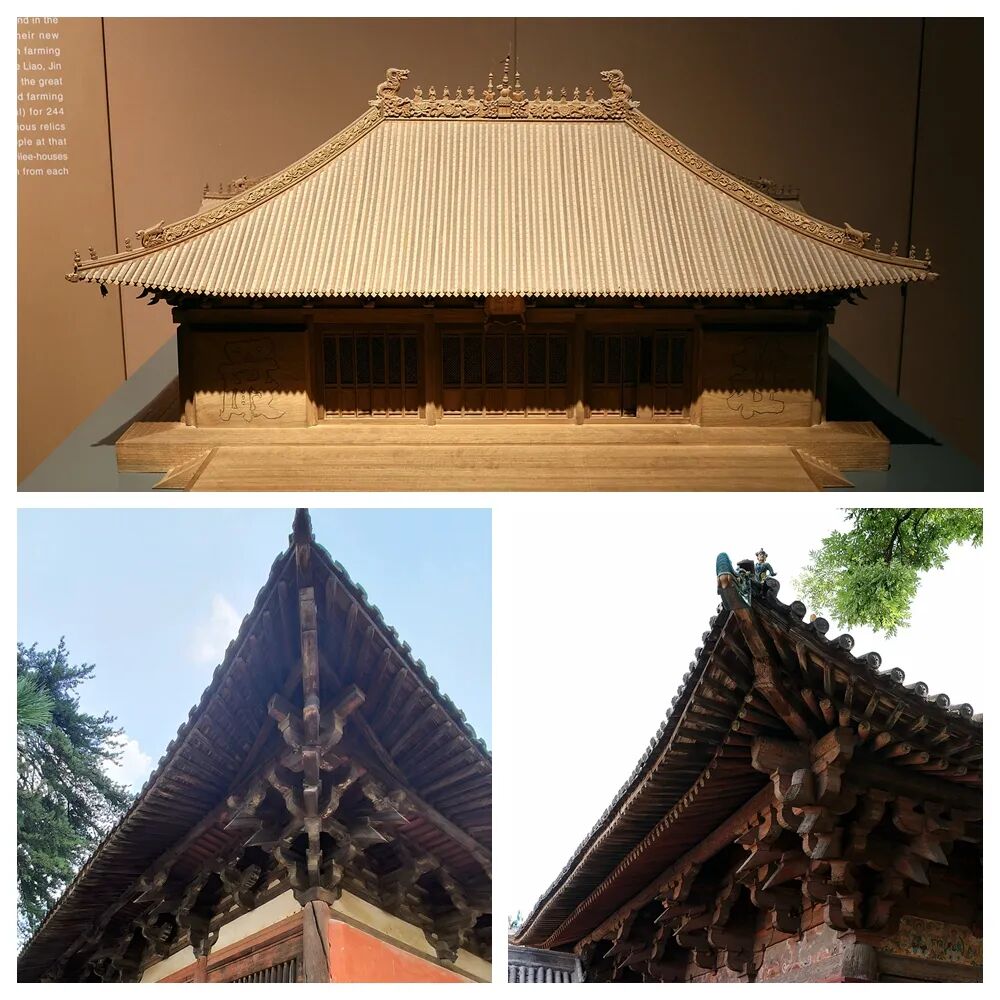永乐寺佛光寺镇国寺一是悬山顶:前后两面坡,分前面和背面,两边墙直上。山墙退后一些,屋顶悬出一些,主要对山墙起到防水保护作用。没有出檐,干燥,没有出檐需求。