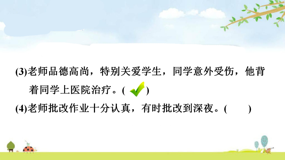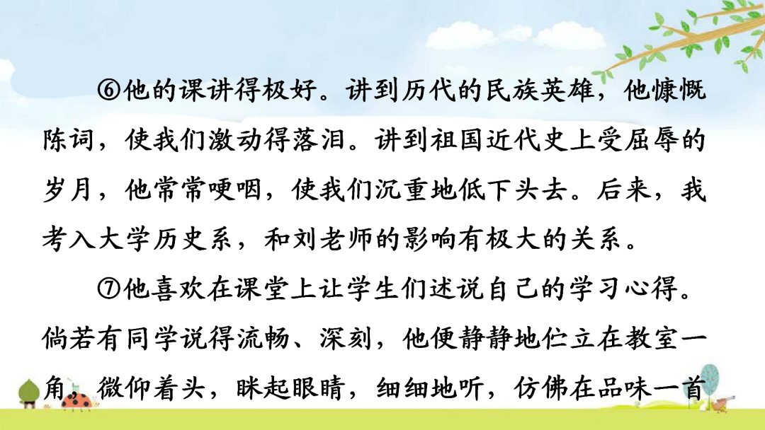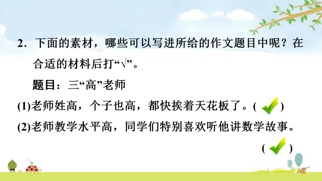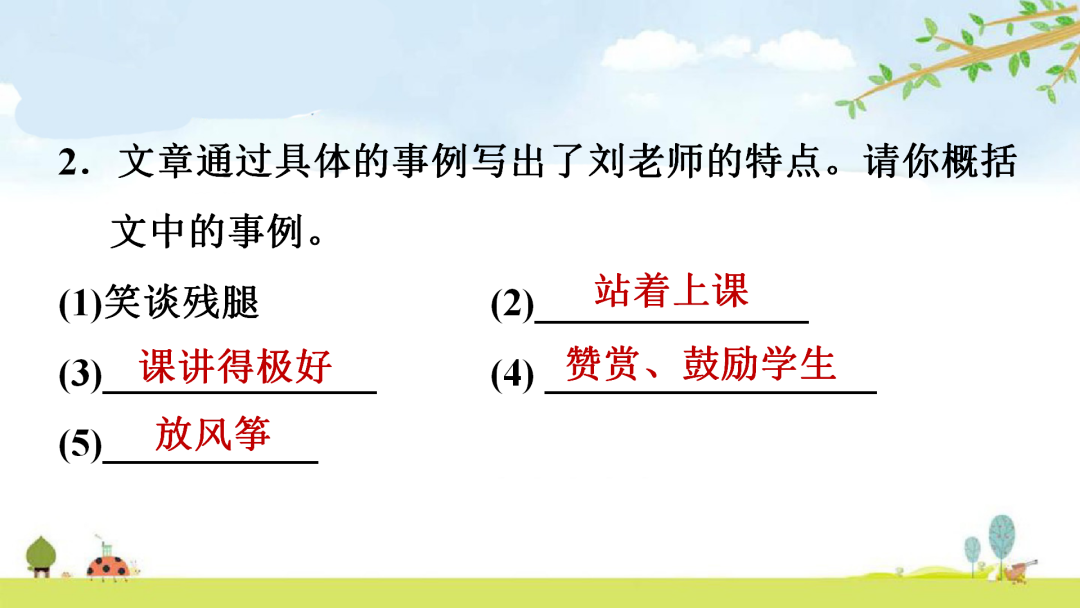 ①选典型事例。反映一个人精神面貌的事例很多,通过一两件事写人就要选取最有代表性的生动事例来写。②叙述事情过程。要写出事情的发展过程,使人物的形象逐步完整。③要把事情写具体。用一两个典型事例记叙一个人,应该把这事例通过人物的动作、语言、神态、心理等写具体,这样人物形象才能丰满。④为了使读者对人物印象更深刻,使重点记叙的事情有充分的依据和坚实的思想基础,使人物的形象更加丰富,文章的开头可以对人物的突出。通过人物在事件中表现,如动作、语言、神态、心理活动等使它构成整个情节的最典型的部分,突显人物的特点,使文章显得生动真实,从而达到写作的目的。比如动作描写要准确运用动词,语言描写要符合人物的身份……能突出人物的特点,表达老师可爱又有趣的一面。 我有一位知识渊博,对学生和蔼可亲的好老师,她那双明亮的大眼睛里透露着淳朴、温情,她为教育事业尽心尽力,时时刻刻关爱着我们。她就是我们班的班主任——王元菊老师。 记得我刚转来这个班的时候,非常胆小,对王老师十分陌生,老师上课提问题时,我几乎没举过手,只是低着头一边默默的思考,一边担心老师会不会叫到我。“张雅楠”老师恰好点到我的名字,那时我吓得心怦怦直跳,生怕自己回答错误,闹出笑话。但是“军令如山”我不得不慢慢的站了起来,吞吞吐吐地回答老师提出的问题,声音小得像蚊子哼似的。但老师没有批评我,反而还亲切的对我说:“回答得完全正确,如果声音再响亮些,就更好了。”老师的鼓励像一股暖流,流遍了全身。从那以后,对老师提出的问题,只要我知道的,我都能积极的举手回答,而且声音响亮,老师和同学都向我投来了赞许的目光。从她的眼里我懂得了什么叫鼓励。王老师不但在学习上鼓励我们,而且能包容我们的错误。记得有一次,周文江同学没交作业,但老师在改我们的作业时就发现了。上课时,老师并没有当众点他的名,而是在下课时把他叫进办公室,给他讲了许多道理,他看着老师温情的目光,听着老师那谆谆的教诲。从那以后,周文江同学再也没犯过同样的错误。 老师,您是辛苦的园丁,为我们“修枝剪叶”,为了让我们开得更灿烂、更鲜艳,您费尽了心思。老师,请您相信,我一定会用优异的成绩来报答您。我的幽默老师姓林,全名叫做林小勤,是我们班的数学老师。他高高瘦瘦的,偏偏戴着一副超大的黑边眼镜,与他时常穿的灰色西装很不搭调,但是与他的幽默性格却保持了高度一致。他总喜欢做一些搞笑的事来逗同学们开心,每次上课都把同学们逗得开怀大笑。就连让同学们打起精神来上课的方法也很搞笑呢!每当这时他总是用手扶一扶他的黑边眼镜。记得有一次,林老师上课时,看见陆俊正在望着窗外发呆,便笑着问陆俊:“陆俊哥啊,你是不是该改名叫做‘呆哥’啊?”听了这话,全班同学顿时哈哈大笑起来。”呆哥”也从同学们爽朗的笑声中惊醒过来,也在下面害羞地笑。林老师用手扶了扶黑边眼镜继续上课,后半堂课同学们都听得很专心。还有一次,在数学课上天才般的我,因一时疏忽而写错了最简单的一道题,林老师看见了,便问:“黄若龙啊,你到底是天才还是懒人啊?”这下,同学们更是笑得合不上嘴了,看到林老师伸出手扶眼镜,我也不由自主地笑了。这就是林老师的逗人方法之一——取外号。除了取外号,林老师还有一种方法既能让同学们打起精神来上课,又能让同学们开心呢!记得那是一个星期五的下午,同学们因为没有午睡,所以都无精打采的。林老师扶了扶眼镜框,一脸严肃,看着我们问:“你们是不是没兴趣听我这个‘痴婆’的课啊?用不用找个乌鸦嘴上来帮我讲啊?”听了这话,同学们都忍不住哈哈大笑,笑完后,个个精神头十足,林老师开始继续上课了。总评:本文作者选取了三件事,从老师给学生“起外号”逗人开心和让学生打起精神上课方法两个角度,写出了林老师的幽默特点。小作者通过对人物的衣着、动作、语言、神态的描写令林老师的形象更加丰满。特别是“扶眼镜框”的动作,与性格特点如影随形,读后,又可爱又有趣的林老师令人难忘。我有一位知识渊博,对学生和蔼可亲的好老师,她那双明亮的大眼睛里透露着淳朴、温情,她为教育事业尽心尽力,时时刻刻关爱着我们。她就是我们班的班主任——王元菊老师。记得我刚转来这个班的时候,非常胆小,对王老师十分陌生,老师上课提问题时,我几乎没举过手,只是低着头一边默默的思考,一边担心老师会不会叫到我。“张雅楠”老师恰好点到我的名字,那时我吓得心怦怦直跳,生怕自己回答错误,闹出笑话。但是“军令如山”我不得不慢慢的站了起来,吞吞吐吐地回答老师提出的问题,声音小得像蚊子哼似的。但老师没有批评我,反而还亲切的对我说:“回答得完全正确,如果声音再响亮些,就更好了。”老师的鼓励像一股暖流,流遍了全身。从那以后,对老师提出的问题,只要我知道的,我都能积极的举手回答,而且声音响亮,老师和同学都向我投来了赞许的目光。从她的眼里我懂得了什么叫鼓励。王老师不但在学习上鼓励我们,而且能包容我们的错误。记得有一次,周文江同学没交作业,但老师在改我们的作业时就发现了。上课时,老师并没有当众点他的名,而是在下课时把他叫进办公室,给他讲了许多道理,他看着老师温情的目光,听着老师那谆谆的
