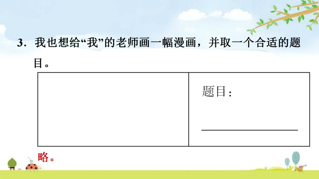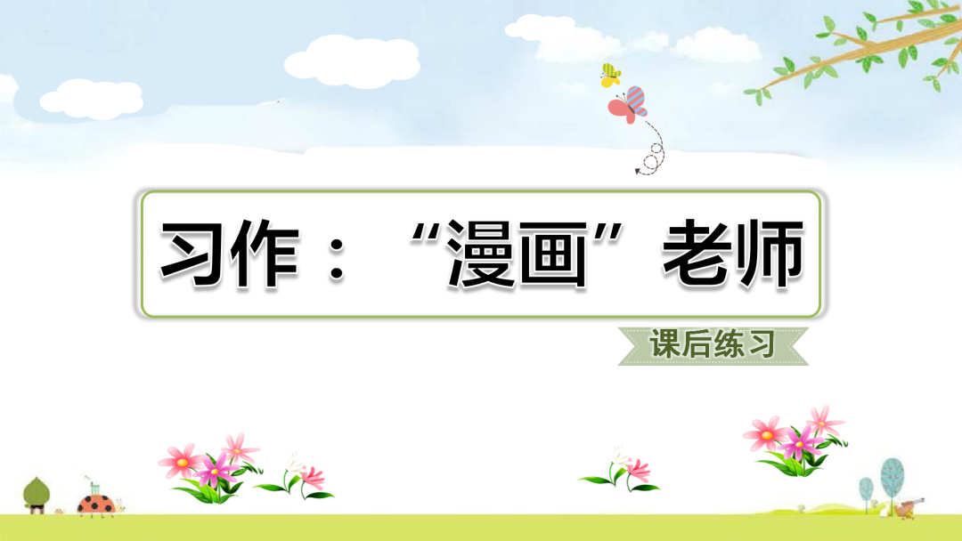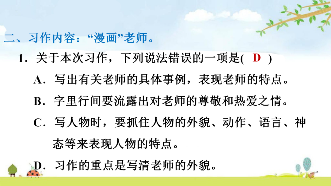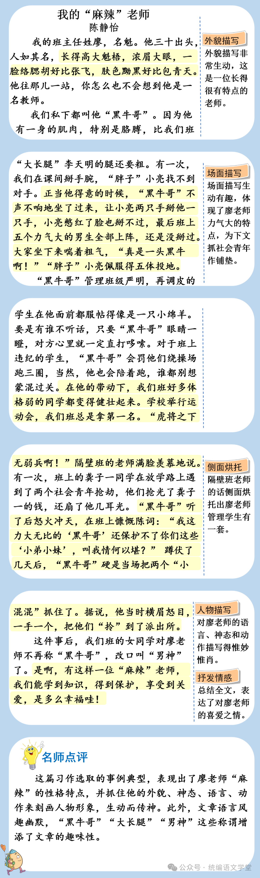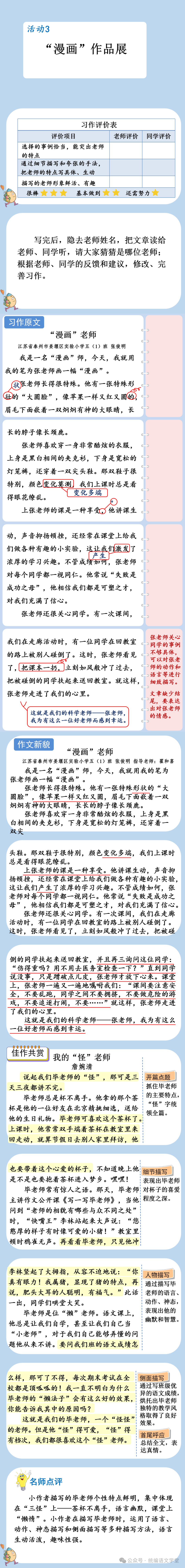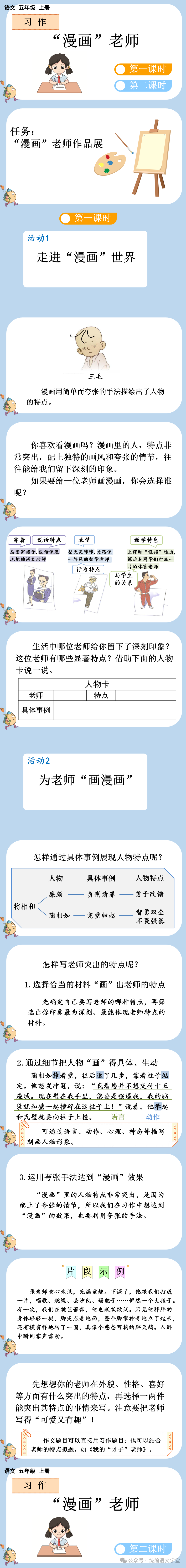 《“漫画”老师》是一篇写人的作文。要选择一位有突出特点的老师,还要选择一两件能突出其特点的事情来写,写出老师的可爱和有趣。 3.能结合具体的事例突出老师的特点,表达对老师的敬爱之情。a.要像画漫画一样,采用独特的画风和夸张的情节,来突出老师的特点,选择有突出特点的老师很关键。b.选择的事例要能体现人物特点。要关注人物的细节描写,体现人物的特点。写作时要抓住最有特点的一个方面写,比如外貌描写,每个人的外貌都有与众不同的特点,描写人物的外貌是为了突出中心,表现人物特点,所以描写人物外貌不可面面俱到,只需抓住这个人与其他人不同的地方,进行重点、具体描写。通过外貌描写,表现人物的精神面貌和内心活动,千万不能面面俱到。人物的特点要通过具体的事情来体现,所以选择一两件典型的能够突出老师特点的事情就是我们选定人物后首先要考虑的。事情的选择一定是与人物的特点一致的,比如上面觉得喜好独特,此处事情选择也要突出喜好独特这个特点,不能前后不一。