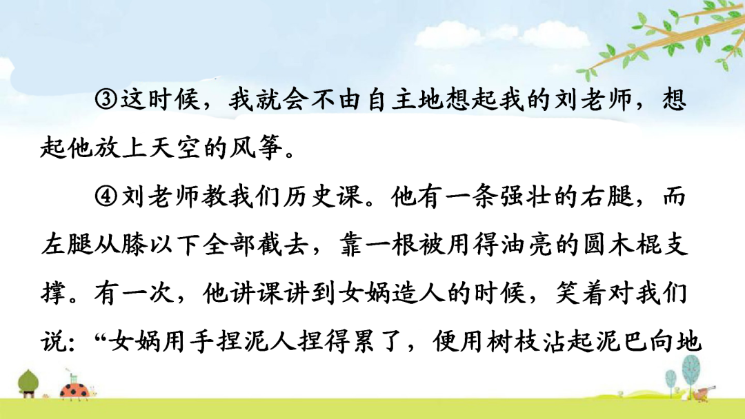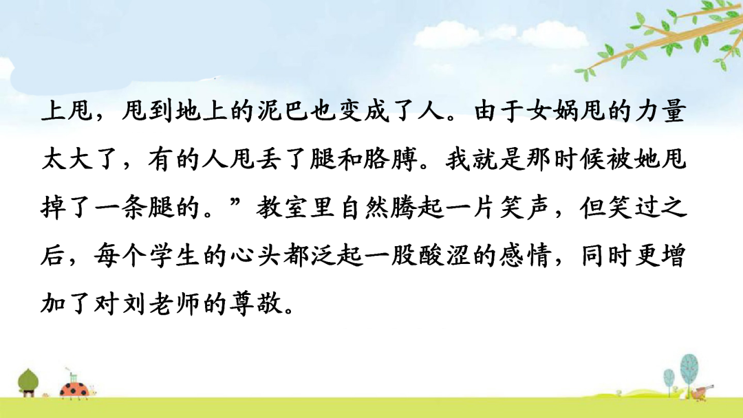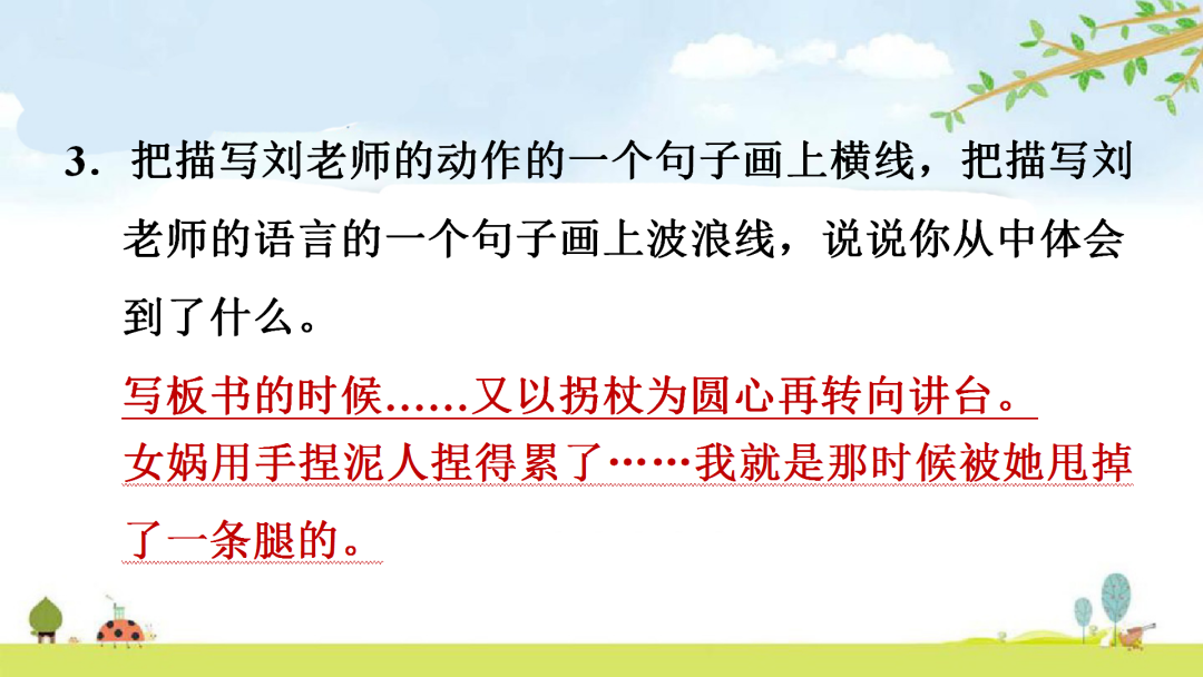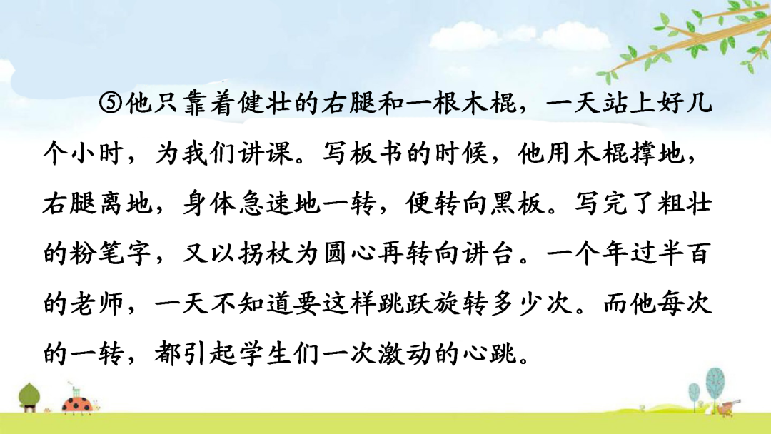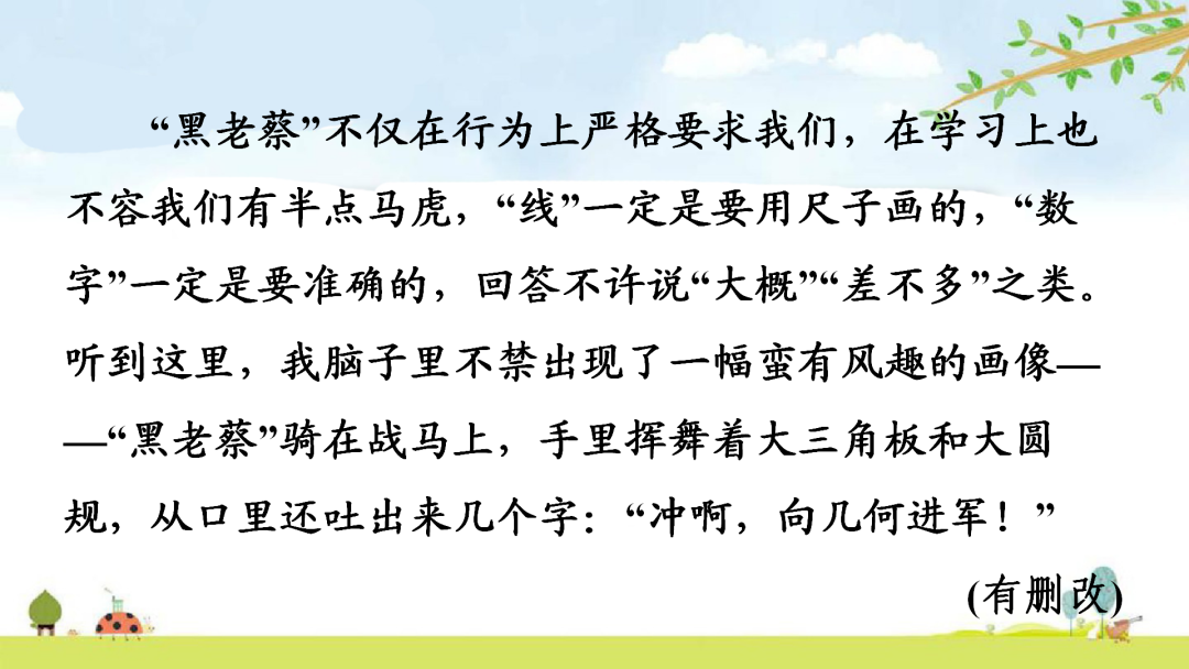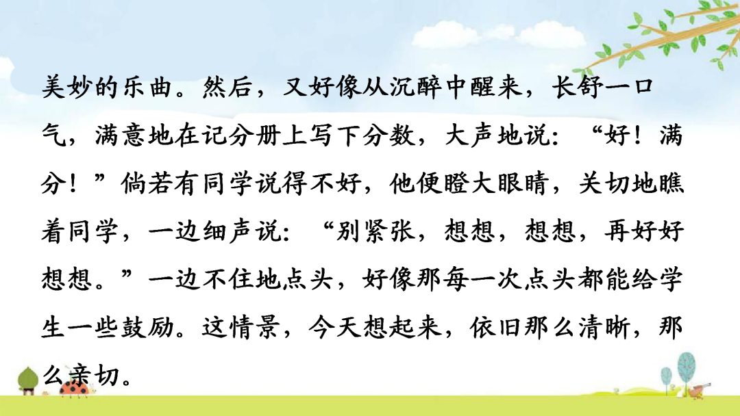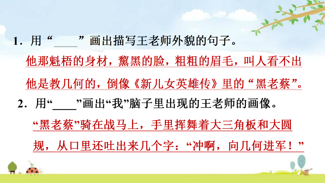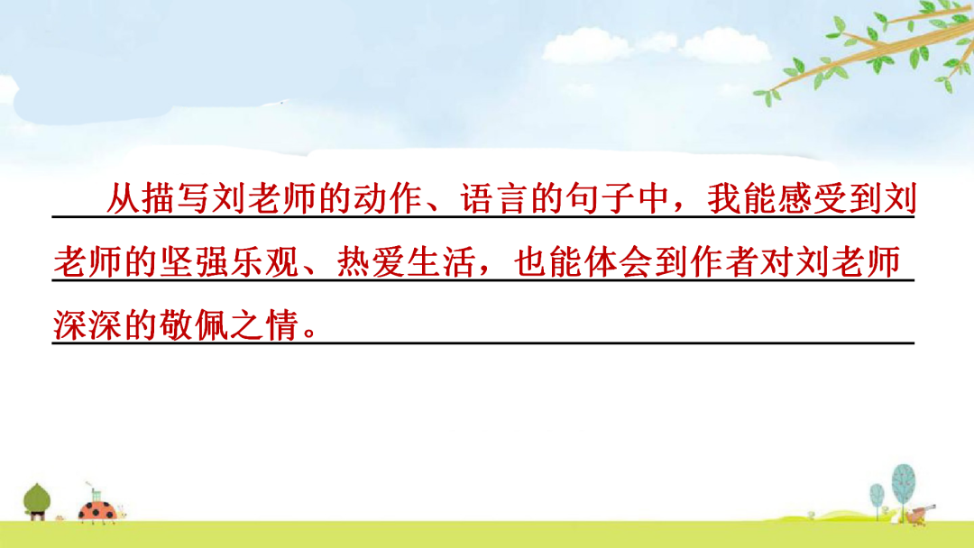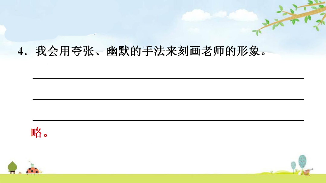 《“漫画”老师》是一篇写人的作文。要选择一位有突出特点的老师,还要选择一两件能突出其特点的事情来写,写出老师的可爱和有趣。 3.能结合具体的事例突出老师的特点,表达对老师的敬爱之情。a.要像画漫画一样,采用独特的画风和夸张的情节,来突出老师的特点,选择有突出特点的老师很关键。b.选择的事例要能体现人物特点。要关注人物的细节描写,体现人物的特点。写作时要抓住最有特点的一个方面写,比如外貌描写,每个人的外貌都有与众不同的特点,描写人物的外貌是为了突出中心,表现人物特点,所以描写人物外貌不可面面俱到,只需抓住这个人与其他人不同的地方,进行重点、具体描写。通过外貌描写,表现人物的精神面貌和内心活动,千万不能面面俱到。人物的特点要通过具体的事情来体现,所以选择一两件典型的能够突出老师特点的事情就是我们选定人物后首先要考虑的。事情的选择一定是与人物的特点一致的,比如上面觉得喜好独特,此处事情选择也要突出喜好独特这个特点,不能前后不一。