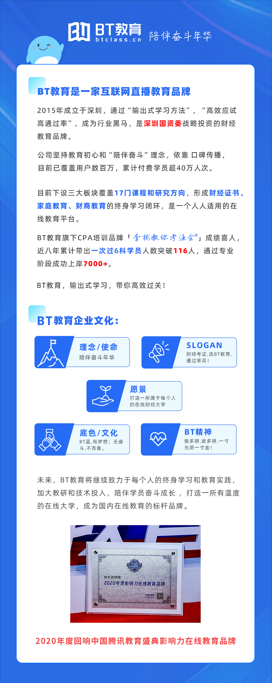 我们不是一家普通的培训机构,专注于财经考证和陪伴学习,覆盖用户过百万,累计付费学员超40万人次,是深圳国资委战略投资的财经教育品牌。目前下设三大板块覆盖CPA、法考、初/中级会计职称、保荐代表人、税务师、家长课堂、理财实践课等17门课程,形成财经证书、家庭教育、财商教育的终身学习闭环,以高效应试、高通过率著称,陪伴每一位学员奋斗成长。