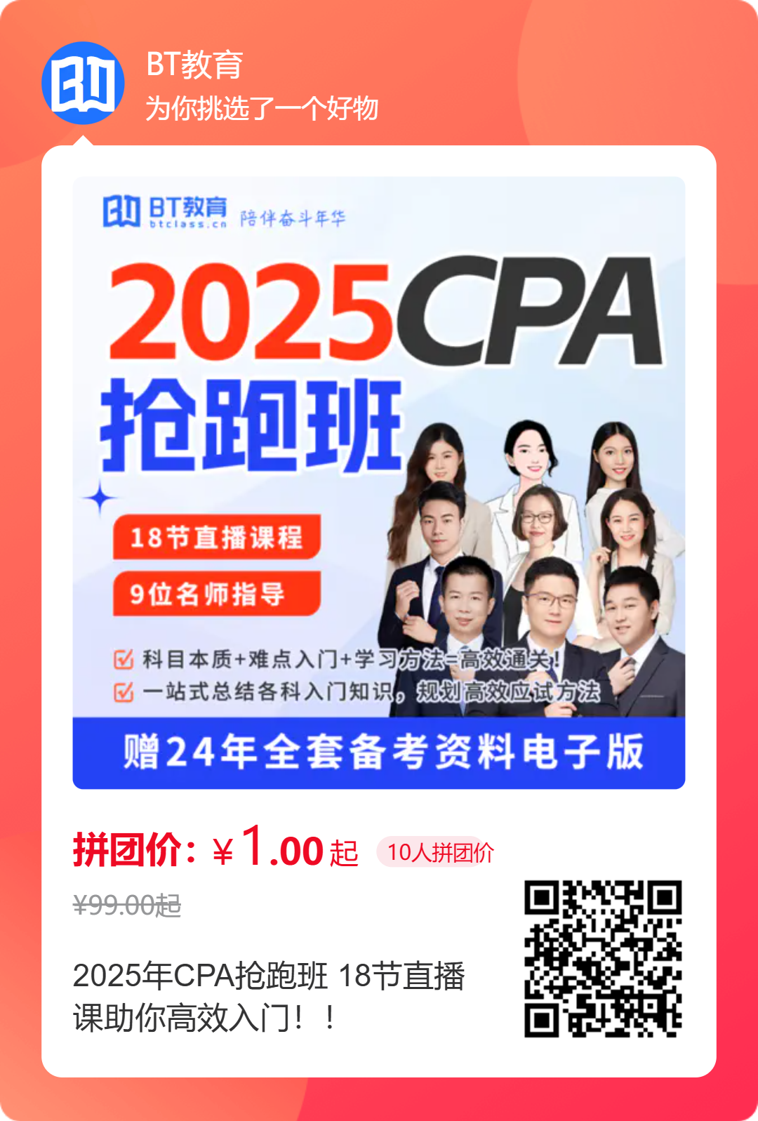 学员入学前必看:一旦选择了信任,请坚持到底,不要轻易放弃,因为报名了BT,就意味着接下来吃苦努力的日子要来了,但相信自己,拿证的日子也快了。②能够接受并适应BT教育的班级管理和督促方式的考生。老师、班主任(助教)、班长、组长,与大家一起,共同为一个目标努力,帮助每一个人过关,能够接受并适应这种线上班级管理的模式,与大家成为朋友的考生,请赶快加入我们大家庭。③“报BT,就必过”的决心和信心。若抱着“玩一玩”的心态就不要报名了,因为多半会放弃,还会影响其他努力的同学。如果不重视,建议都不要报考。破釜沉舟一起奋斗,抱有2025年必过的强烈决心和信心,你就已经成功一半了,加上BT的方法和管理,不过都难。④报BT,需要你能接受“同学友谊,圈子文化,朋友文化”。没有互助和分享精神的同学,请勿加入。来了就是BT人,大家都是朋友。考证路上,需要大家埋头苦学,也需要大家互相鼓励和帮助。问:我现在在等CPA成绩,还不能确定科目,10月份还有优惠吗?答:现在CPA课程是全年最优惠的价格,且活动9月29日23:59就结束了,如果现在还不确定科目,也可以先买课,等成绩出来,凭24年CPA过关的成绩单可以全额退款或者免费换科目。问:不太清楚自己的情况适合报名哪个班型,有什么推荐吗?答:BT小班:还剩1~3科未通过,有一定备考经验或基础的同学,时间短,想要快速过关。六神班/六神保障班:针对零基础在职上班族考生,剩下4~6科未通过,希望在1-3年内拿下全部科目,彬哥专属学习计划,需要平均每天投入3-6小时学习时间,坚持半年。私教小班:还剩1~3科未通过,时间紧迫或成绩马上过期,解决久考不过的顽疾科目,小班个性化辅导。私教六神通关班:针对负基础在职上班族学员,或者跨行业考生,还剩下4~6科未通过,希望在2-3年内拿下全部科目,双师辅导保障,个性化班主任服务。VIP持证班:针对零基础考生,经济预算宽裕的条件下,想在3年内稳打稳扎过六科,VIP多对一辅导,退费协议保障,不过关最高退费80%。对于25备考规划、25年CPA课程等还有其他任何疑问,都可以扫码进群咨询↓↓↓