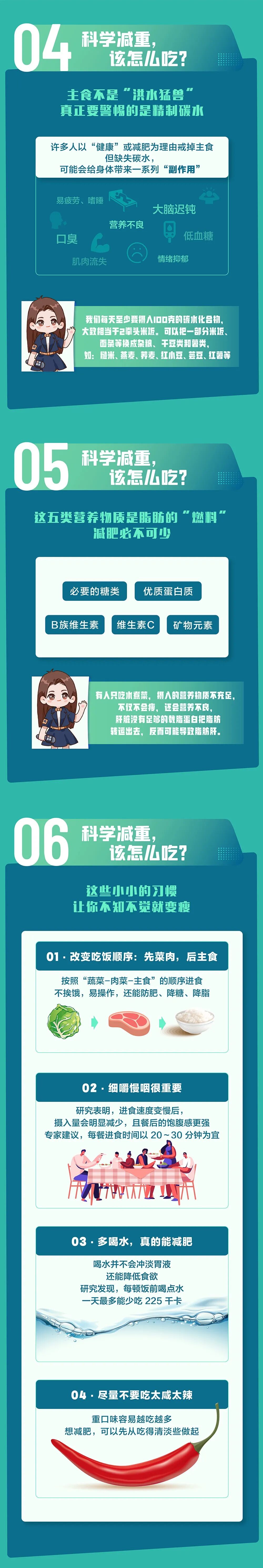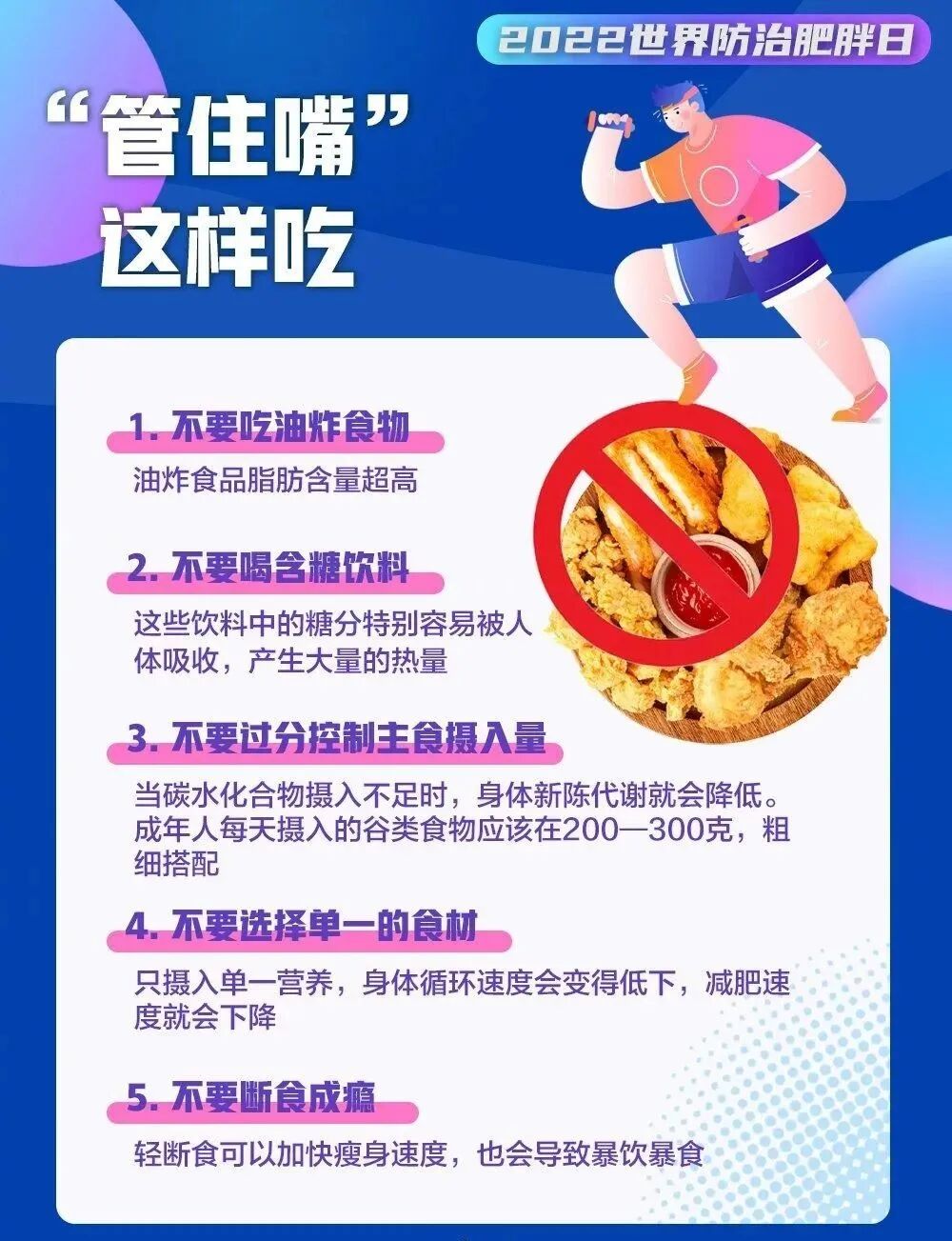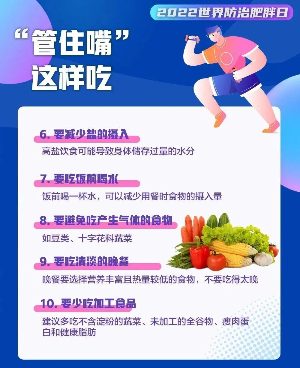 特别提示,减肥从每天的健康早餐开始。每天至少吃4份蔬菜、3份水果。选择全谷物而非精制谷物。使用健康的油脂,例如橄榄油、菜油、果仁酱。此外,减少糖的用量,选择低脂肪的奶制品,每天肉类消耗控制在3盎司(约一副扑克牌体积,约100克)。