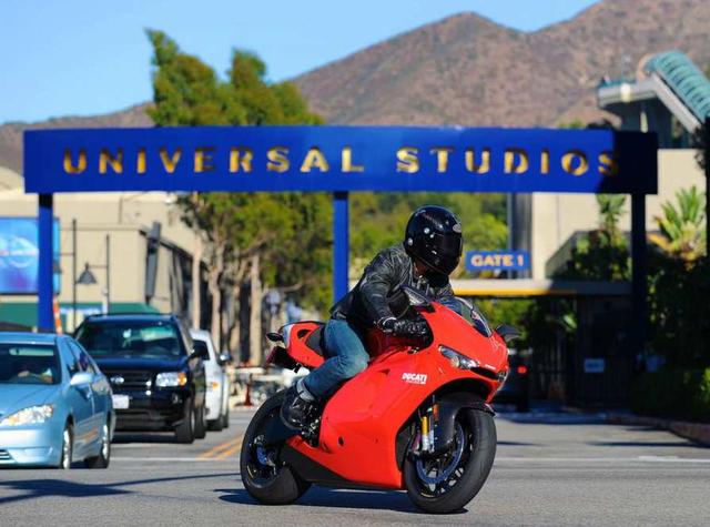 2010年,阿汤哥开着他的定制款红色杜卡迪摩托车从环球制片厂出来。