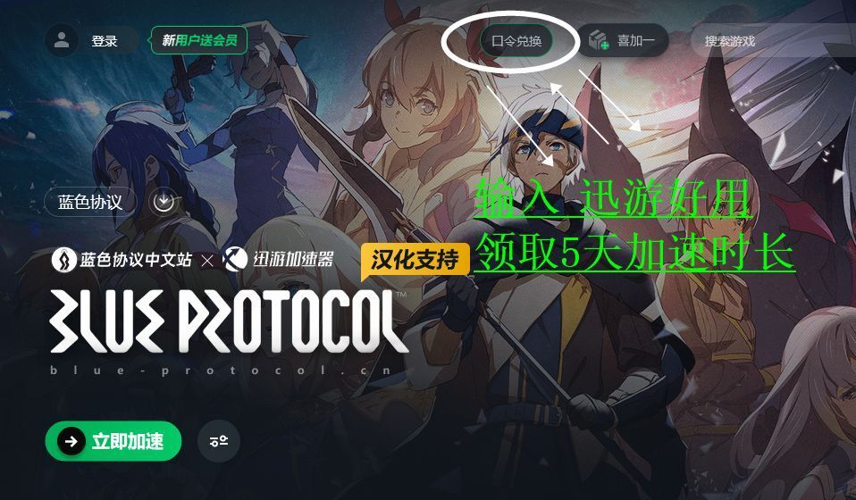 大家如下图进行操作,可以免 费领取5天加速时长:在迅游客 户端口令兑换处输入【迅游好用】。