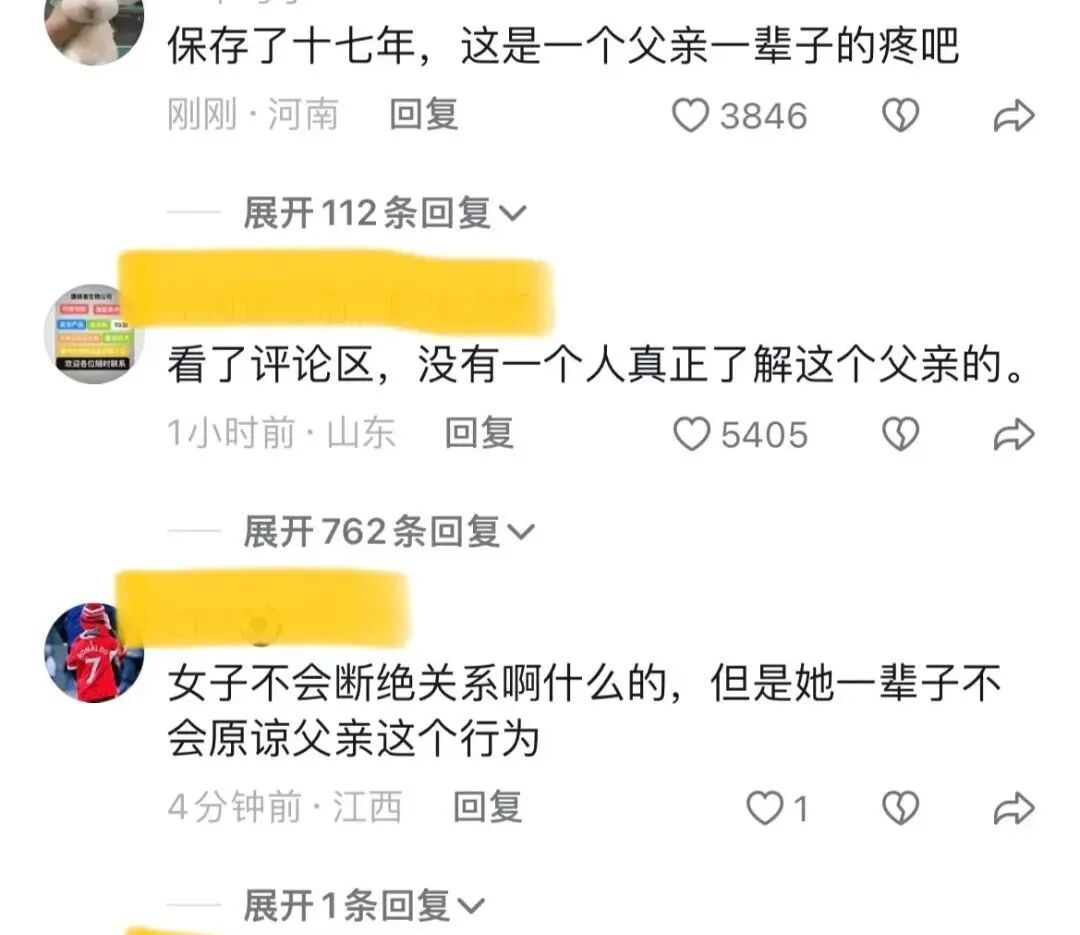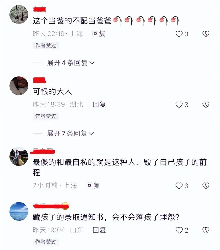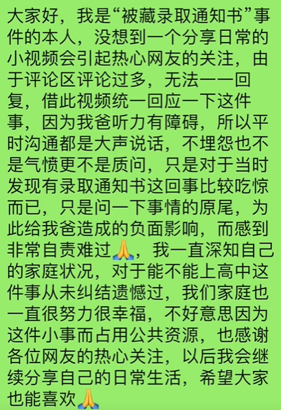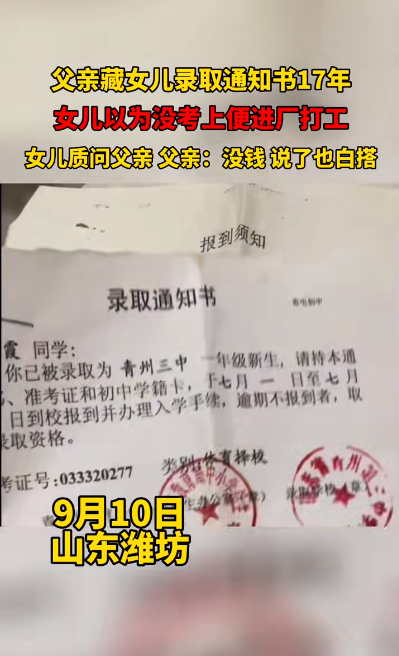 据女子丈夫透露,妻子的父母皆是残障人士,几乎没有劳动能力,家里也没有其他收入来源,当时妻子考高中时,家里还有个三岁的弟弟要养活。这样的家庭状况,哪怕砸锅卖铁,哪怕全家人不吃不喝,哪怕借遍全部的亲朋好友,也绝不可能拿得出这笔昂贵的学费,去上一个名不见经传的高中。所以父亲直接选择了隐瞒,但他没有将录取通知书直接扔掉,而是选择封存起来,这说明他的内心也是挣扎过的,但迫于现实的窘境,他只能将莫大的愧疚咽下,断了女儿的念想。从父亲拿出完好无损的通知书看,父亲收藏得很好。也许这些年,趁女儿不在家时,父亲无数次拿出录取通知书看过,心里应该也有愧疚,甚至,也良心自责过。相信没有哪位父亲是不爱女儿的,当时可能确实有心无力。对于父亲的做法, 网友议论纷纷,有网友说,这个父亲当年肯定是重男轻女,不愿意让女儿读书,白白断送了女儿的前程。还有网友说,没有父亲不爱儿女的,2006年一个农村家庭一年要拿出上万元,有几个家庭拿得出来呢?大家也不要谴责这个父亲了,他应该比任何人都愧疚。不过,也有网友说,理解这个父亲的做法,但是不应该瞒着女儿。这事情完全可以拿到台面上说,瞒着女儿,那就是对女儿17年的精神折磨。虽然对于父亲的做法,实在无法苟同。没有钱送孩子读书,在孩子那里顶多算是遗憾,但是这样做,对女儿来说,就是一种伤害。当然,话说回来,父亲没有文化,估计也想不到那么多。当年的他只能顾着眼前,没想过会伤害女儿。那些谴责父亲的人,也要站在父亲的角度想想,父亲要是心里没有愧疚,早就把通知书毁灭,永远都不让女儿知道。正因为他心里有内疚,所以,一直把通知书留存至今。每次想到这个事情,他心里比任何人都难过。可能力毕竟有限,又有什么办法呢?总不能让父亲真的砸锅卖铁送女儿读吧。2023年9月12日,女子眼瞧着网上指责父亲的声音越来越多,删掉了原有的视频,发文道歉称:“父亲有听力障碍,所以沟通时都是大声说话,没有埋怨也不是气愤,只是对于有录取通知书这件事很吃惊,我一直深知自己的家庭状况,对于能不能上高中从未纠结遗憾过。”但在该视频的评论区中,有网友留言称:“自己压根没考上,还要额外交钱……”当事人回复称:“是的,这次把脸丢姥姥家了……”评论区有网友留言称:“择校属于花钱上高中的那种吧,不是考上的吧……”由于视频发布后许多网友埋怨当事人父亲,当事人回应称:“多骂骂我几句吧,让我清醒清醒……”