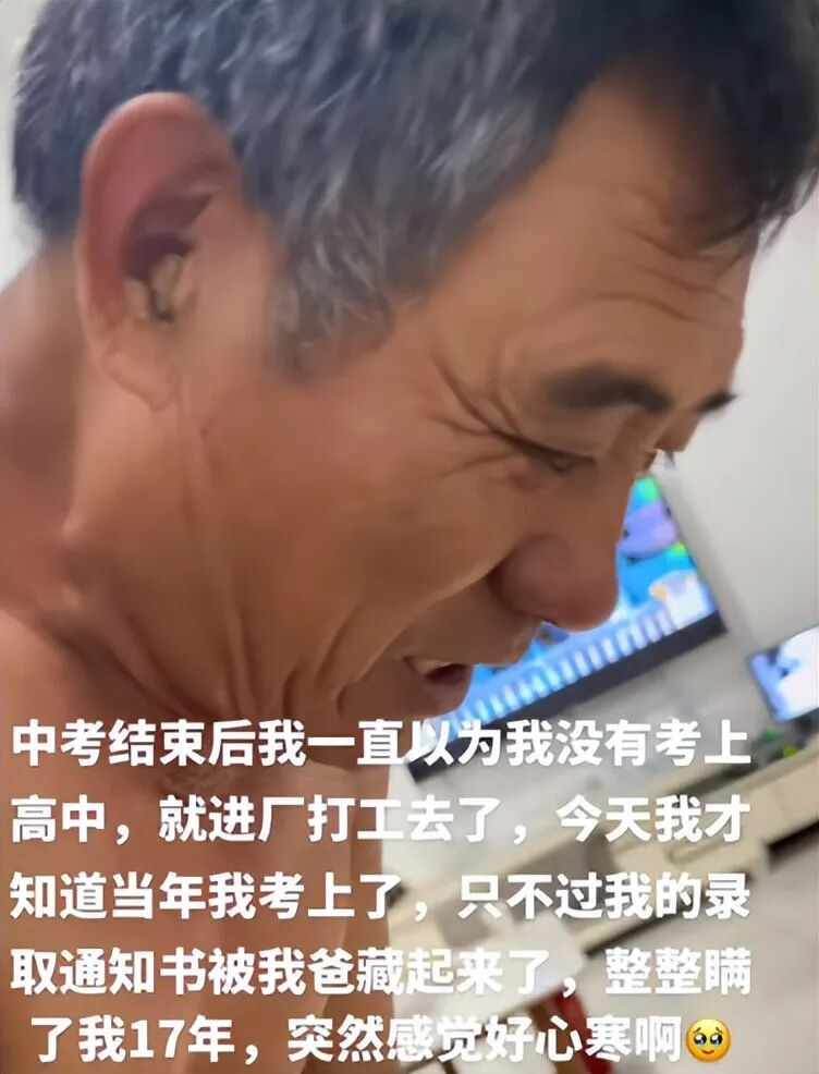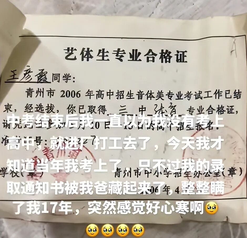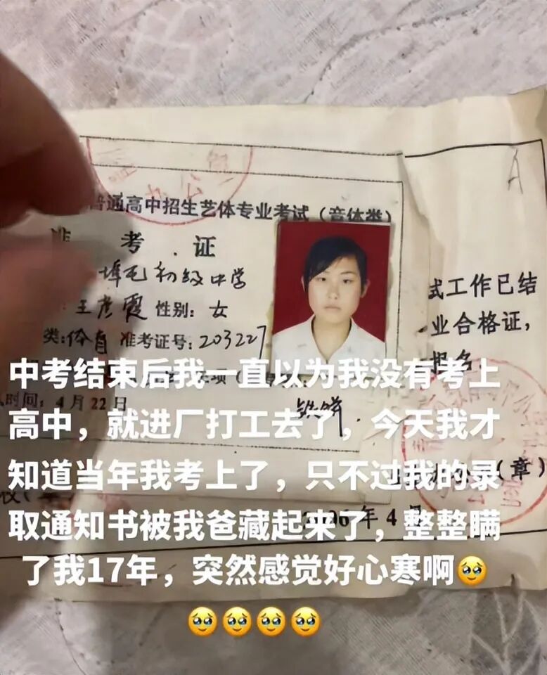 2023年9月10日,一位结婚成家的女子回老家探亲,在整理旧物时,意外发现一个装有各种她儿时照片的旧盒子,一张张翻开来看,儿时的愿景如画一般在眼前铺开。直至翻到初中毕业阶段的照片,沉醉在回忆里的女子陡然被拉回现实。她清晰记得,自己初中毕业以后因为没有考上高中便离家进厂打工去了,留在家里的相片也停留在这一阶段,无忧无虑的童年时光截然而止,往后便只剩下极力谋生的忙碌身影。但相片的最底下却还压着几张早已泛黄泛旧的纸张,上面赫然写着“录取通知书”几个醒目的大字,那是她的高中录取通知书。女子瞬间觉得恍惚,在她记忆里自己是没能考上高中的,这份迟来17年的高中录取通知书自己从未看见过,沉思良久以后,她有了自己的猜测:因为学费过于昂贵的缘故,父亲对她选择了隐瞒,藏起来录取通知书,直接告诉她没考上。顿时心里百感交集的她拿着通知书跑去质问父亲,为啥当初不告诉我?父亲的脸色看起来很不自在,一边刻意回避着女儿的目光,一边自顾自地回答道:“说了也白搭,那时候没有钱。”“中考结束以后我一直以为我没有考上高中,就直接进厂打工去了,直至如今我才知道当年我考上了,只不过录取通知书被我爸藏起来了,整整瞒了我17年啊。”“其实我知道家里什么情况,但是我爸竟然直接选择瞒着我不告诉我,突然感觉好心寒啊。”那是06年的高中录取通知书,具备着一定的含金量,倘若照常上了高中未免不能考个大学拿个本科学历,即便考不上大学,只有高中学历,也不至于只剩下进厂打工这一条路。无数的人本着这样的想法,开始纷纷指责隐瞒的父亲,怒斥父亲的糊涂,“藏起来的不是录取通知书,而是女儿的未来”、“一个举动彻底毁了女儿的一辈子”。很多人都有满肚子的话想说,但是最后可能都将原因归结为贫穷,觉得正是因为没钱,才会不让女儿去读高中,但实际上这只不过是表象,深层次的原因才是根源。或许父亲当初的隐瞒确实是觉得供不起,可扪心自问“真的这么简单吗”,答案是否定的,看似是经济负担重的结果,可根源在于家长的自私和短视,连知情权和决定权都不给女儿。