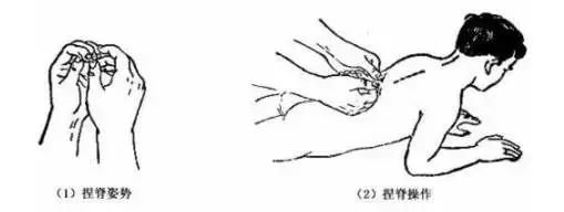 两手拇指伸直,两指端分别置于脊柱两侧,指面向前,顶住皮肉;两手食指、中指前按,掌心朝下。两手拇指指腹与食指、中指指腹相对用力将脊背的皮肉捏起。拇指在后,食指、中指在前。拇指向前推动,两手食指、中指同时交替向后捻动,两者相互配合,边捏边放,颈连绵不断地向项部推移。