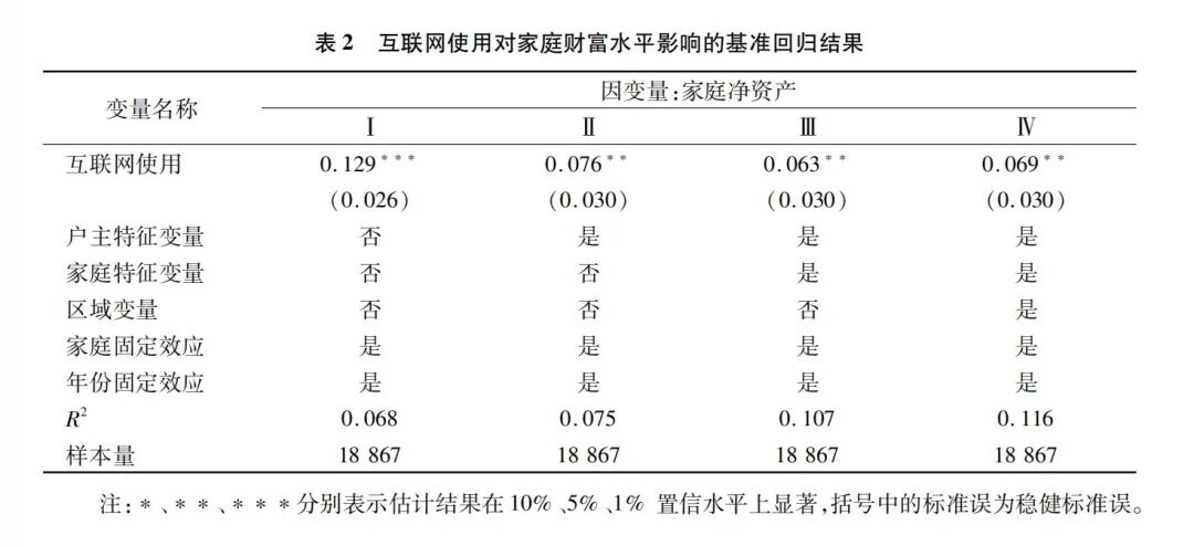 首先,本文运用双向固定效应模型估计了互联网使用对家庭财富水平的影响。如表2所示,Ⅰ列为互联网使用与家庭财富水平的单变量回归结果,估计结果显示互联网使用在1%显著水平上提升了家庭净资产水平。Ⅱ—Ⅳ列依次加入户主特征变量、家庭特征变量以及区域变量后,互联网与家庭净资产之间依然存在显著的正向关系。以Ⅳ列为例,互联网使用的估计系数为0.069,并且在5%水平上显著,这表明如果家庭使用互联网,净资产规模将增加6.9个百分点。因此,假说1得到了验证。