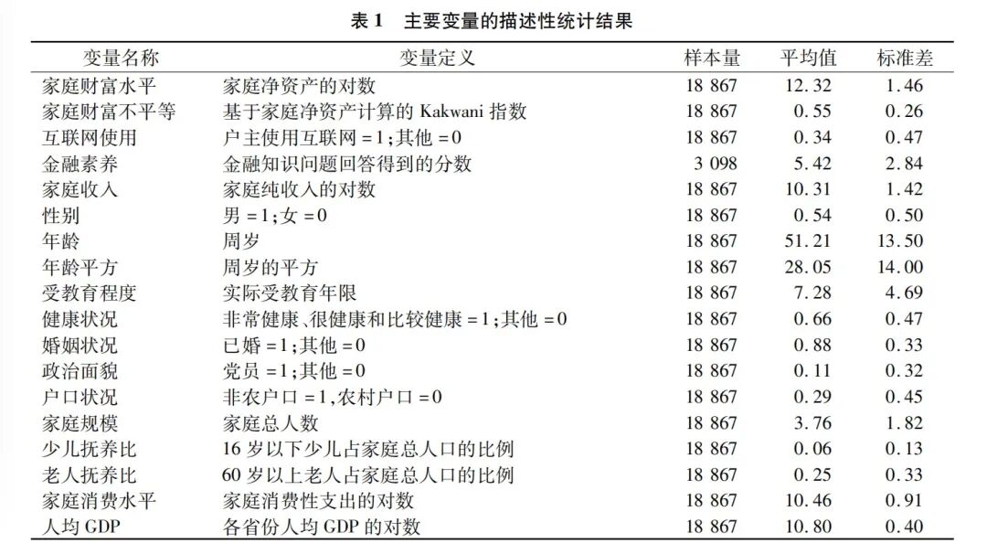 本文核心解释变量为家庭互联网使用情况。根据受访者的回答,如果户主使用互联网,该变量赋值为1,否则为0。本文将中国家庭追踪调查(CFPS)问卷中家庭财务回答人视为户主。