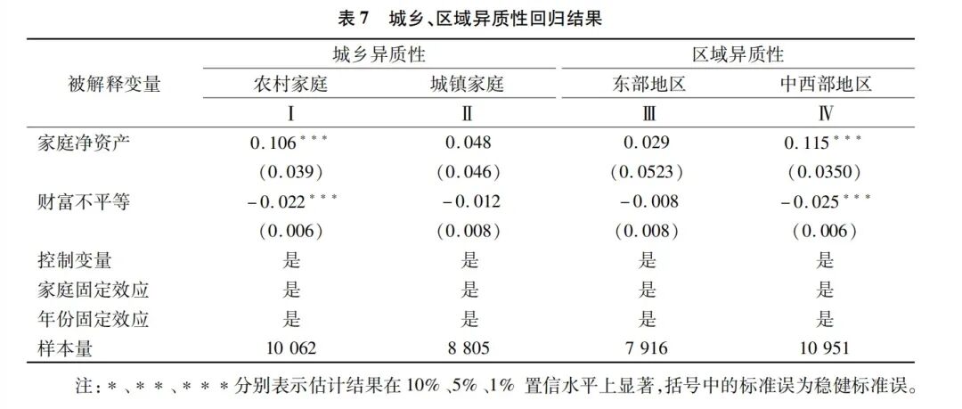 本文根据家庭城乡状况和所在区域对样本进行分组,探究互联网使用对不同特征家庭财富积累与分配的影响差异,估计结果见表7。