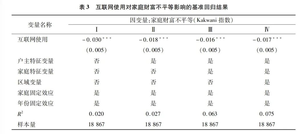 其次,本文运用双向固定效应模型估计了互联网使用对家庭财富不平等的影响。如表3所示,Ⅰ列为互联网使用与家庭财富不平等的单变量回归结果,估计结果显示,互联网使用 1%显著水平上降低了家庭财富不平等。第Ⅱ—Ⅳ列依次加入户主特征变量、家庭特征变量以及区域变量后,互联网与家庭财富不平等之间依然存在显著的负向关系。以Ⅳ列为例,互联网使用的估计系数为-0.017,且在1%水平上显著,这表明家庭使用互联网后,Kakwani指数会降低0.017个单位,互联网使用显著降低了家庭财富不平等程度。因此,假说2得到了验证。