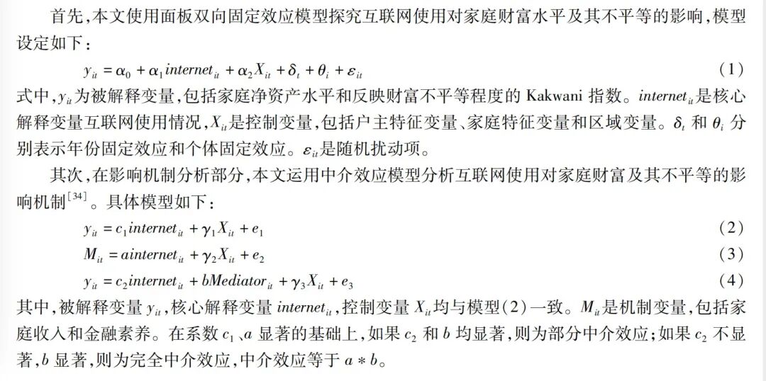 作为现代信息技术的重要组成部分,互联网发展迅猛并得到广泛应用,对经济社会发展带来了深远的影响。在宏观层面,互联网带来了多个维度的影响,主要包括经济增长、国际贸易、劳动力市场等方面。在微观层面,互联网影响着人们的就业方式、消费与投资决策、幸福感等方方面面。虽然互联网技术已经成为影响个体经济决策的重要因素,但探讨互联网影响家庭财富积累与分配的文献还较为缺乏。仅有强国令、商城使用微观截面数据探讨了地区互联网普及与家庭财富差距的关系,但该研究使用社区层面互联网普及率这一指标进行分析,忽略了在互联网使用方面的个体异质性。该文使用不同分位点家庭财富规模之间的差值作为财富不平等的度量指标,只考虑了分位点的财富分配状况,而忽略了分位点之间群体的财富分配信息;在研究内容方面,该文也并未进一步探讨互联网影响家庭财富分配的具体作用机制。