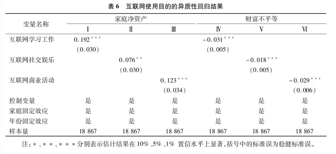 表6汇报了以互联网使用目的为关键解释变量的估计结果,结果显示互联网使用目的对家庭财富积累与分配的影响具有异质性,使用互联网学习工作对促进家庭财富积累、缩小财富差距的影响最大,使用互联网进行商业活动的影响次之,而使用互联网社交娱乐产生的影响最小。可能是因为使用互联网学习、工作以及进行商业活动有助于提高人力资本与金融素养水平,改善就业状况以及提升劳动生产率,增加家庭收入,从而对家庭财富积累与分配的产生较大的积极影响。由于上网聊天、看视频等社交娱乐行为仅能通过获取外界信息,对家庭经济行为产生影响,因此对家庭财富积累与分配的影响较小。