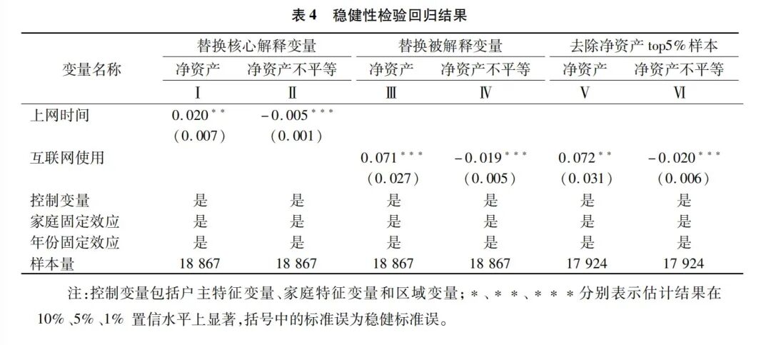 样本数据中少数家庭的财富水平极高,为了排除极端值对估计结果的影响,本文通过剔除财富水平位于顶端5%的家庭样本,以验证估计结果的稳健性,估计结果见表4的Ⅴ和Ⅵ列。可以看出,剔除财富极端值后,估计系数依然表明互联网使用能够显著促进家庭财富积累,降低家庭财富不平等程度,与基准回归结论一致。