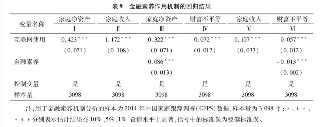 以金融素养作为机制变量的中介效应模型的估计结果见表9。Ⅰ和Ⅳ列分别汇报了互联网使用对家庭财富水平和财富不平等的估计结果,可以看出,互联网使用能够显著促进家庭财富积累,降低家庭财富不平等程度。Ⅱ和Ⅴ列汇报了互联网使用对机制变量(金融素养)的估计结果,表明互联网能够显著提升家庭金融素养水平。Ⅲ和Ⅵ列汇报了互联网和金融素养对家庭财富水平和财富不平等的估计结果,可以看出,互联网和金融素养均能显著促进家庭财富积累,降低家庭财富不平等,并且在引入中介变量后,互联网使用对家庭财富水平的估计系数由0.423下降到0.322,金融素养在互联网使用与家庭财富水平之间起到部分中介作用;互联网使用对家庭财富不平等的估计系数由-0.072上升到-0.057,说明金融素养在互联网使用与家庭财富不平等之间也发挥部分中介作用。由此,假说4得到了验证。