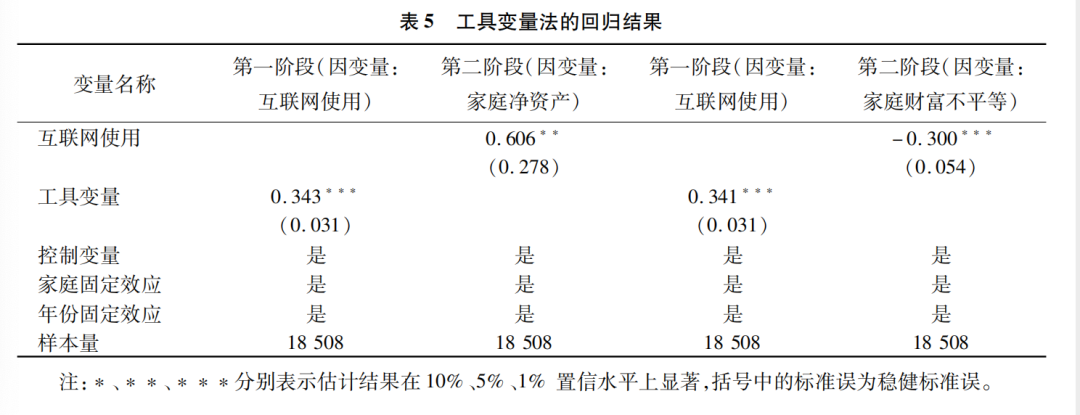 虽然上述一系列稳健性检验一致认为本文结论较为可靠,但可能由于内生性问题导致结论存在局限性。具体来说,尽管本文在回归中加入了尽可能多的控制变量,并且运用面板双向固定效应模型控制了不随时间变化的遗漏变量带来的内生性问题,但由于存在随时间变化的不可观测因素以及反向因果的问题,是否使用互联网这一关键解释变量仍可能存在内生性问题。一方面,存在诸如个人能力、投资偏好、社会环境等不可观测或无法准确度量的因素,这些因素可能会对家庭财富状况以及互联网使用情况产生影响;另一方面,家庭财富积累与分配情况可能会反过来影响互联网的使用,例如财富水平较高、财富相对剥夺程度较低的家庭拥有上网设备、接入互联网的可能性更大。为了保证估计结果准确性,本文通过寻找工具变量克服内生性带来的估计偏差。参照已有文献,本文选取区县层面其他家庭互联网使用率均值作为工具变量。合理的工具变量要与所替代的内生性解释变量高度相关,同时与模型中的随机误差项不相关。地区互联网使用率均值反映了互联网在当地的普及程度,由于社会网络、信息交流等原因,地区互联网使用率与家庭互联网使用情况高度相关,同时区县内其他家庭互联网使用情况与本家庭的财富状况没有直接关系。因此,该工具变量较好地满足了相关性和外生性要求。表5报告了工具变量法的估计结果。结果显示,在第一阶段回归中,工具变量的估计系数在1%水平上显著为正,表明工具变量与家庭互联网使用情况高度相关。第二阶段回归结果显示,互联网使用在 5%显著水平上与家庭净资产正相关,在1%显著水平上与家庭财富不平等负相关,与基准回归结论一致。
