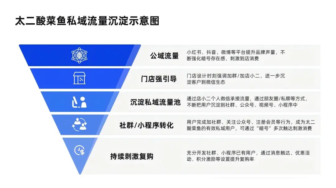 如果说门店是餐饮企业的脸面,那么消费者运营就是餐饮企业的灵魂。太二酸菜鱼线上营销多点开花,以更容易触达核心消费者的微信为私域营销主要基地,而公域平台小红书、微博、抖音等作为品宣辅助,形成一个相互影响的“微信+多平台”的用户运营宇宙。