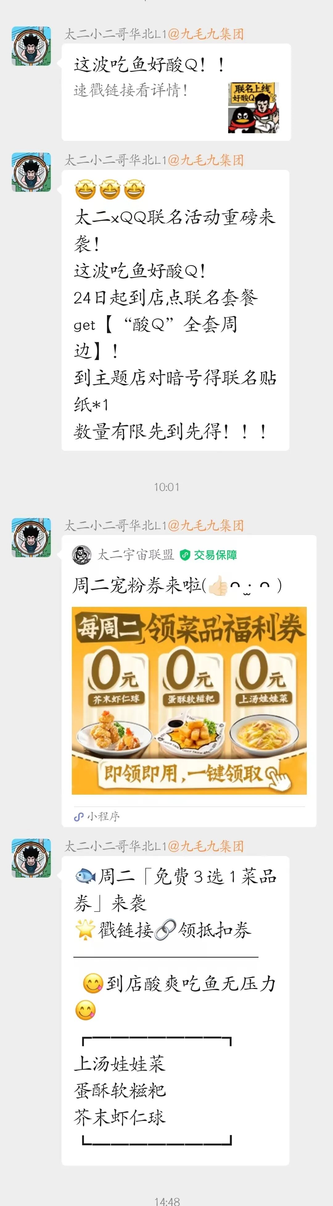 私域营销绝非一次性的交易,持续通过私域策略促进复购才是成功的关键。据数据显示,首次消费的用户复购率大约为10%,而使用小程序的用户复购率则在13-15%之间,相比之下,社群用户的复购率可高达30%以上,这充分证明了社群营销在影响消费者决策上的强大作用。太二宇宙联盟社群的活跃时段主要集中在上午10:30至11:00以及下午16:00至17:00,即饭前的高峰时段。在这些时段,小二哥通过邀请新成员加入社群、发起互动话题、推送优惠暗号等手段,有效提升了社群的活跃度,并激发了消费者的二次购买欲望。目前,太二酸菜鱼已经形成了以“微信私域营销+多平台品牌宣传”为核心的策略体系。无论市场如何波动,太二酸菜鱼始终致力于追求卓越,从20%的核心客户中实现了80%的营收增长,这正是私域营销所带来的显著成效。
