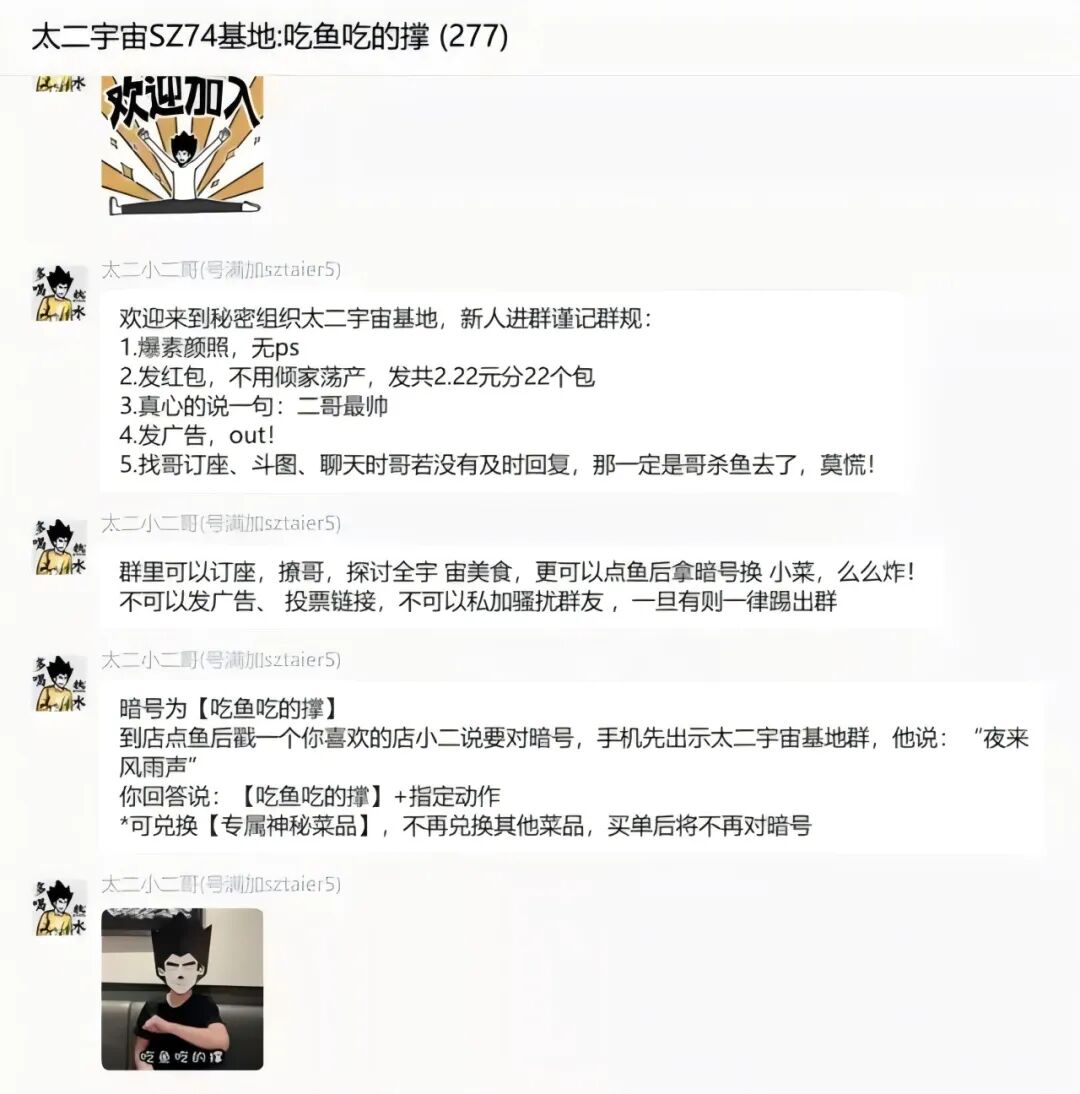 差异化的店规、拟人化IP形象,使得太二已然形成了自身独有的“品牌风格”,而为了让消费者感受到这种“独特性”,太二在运营上还有一个特色——私域暗号。