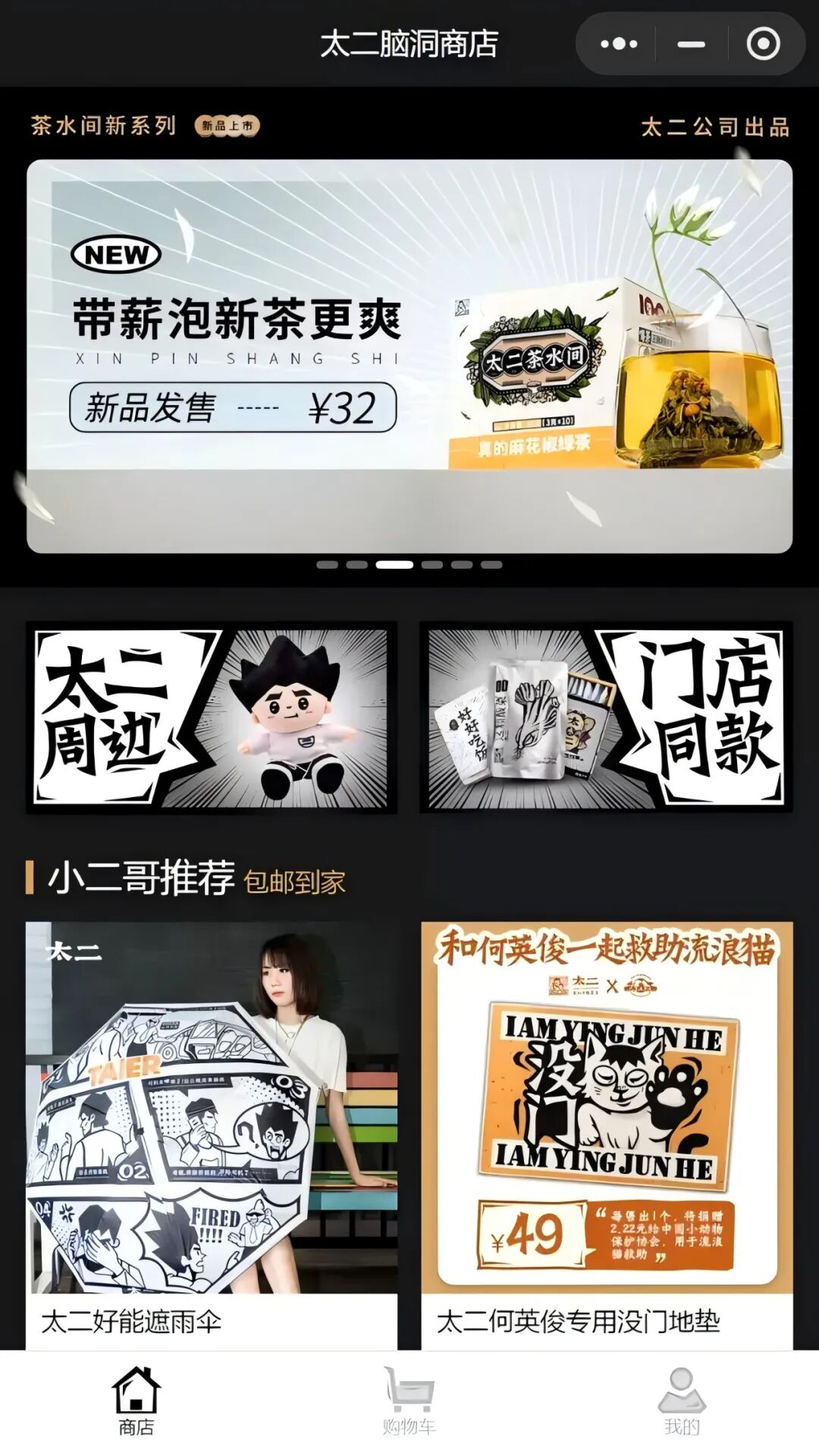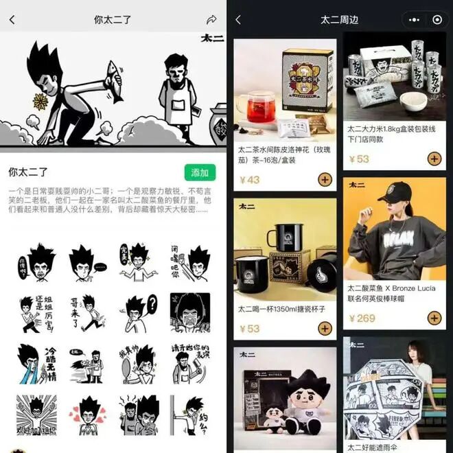 这种传播效果,是许多品牌梦寐以求的。有了成功的IP,周边产品的开发自然是水到渠成。太二以两位主角为原型,推出了表情包和各类周边产品。在微信表情包页面搜索“太二”,便能看到一系列以“你太二了”为主题的逗趣表情包,它们延续了IP的幽默形象和黑白漫画风格,而小程序店铺上的周边产品也是如此。