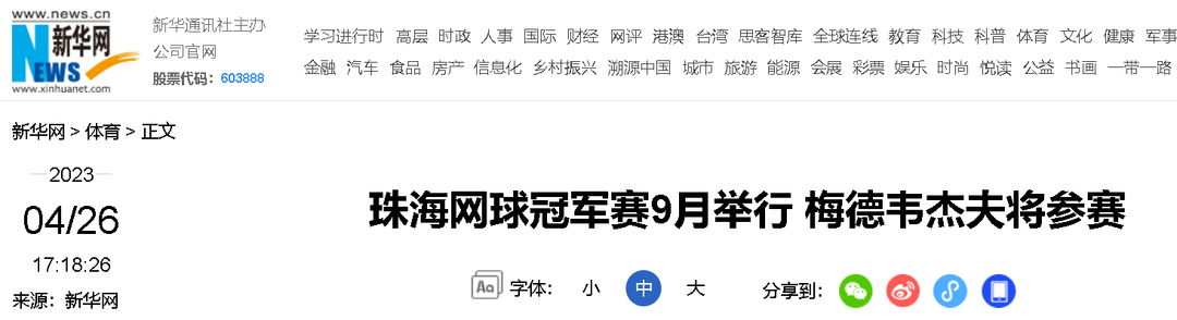 新华社、中新网、《南方日报》报道,4月26日,华发集团与男子职业网球选手协会(ATP)联合宣布,2023年珠海网球冠军赛将于9月20日至26日在横琴国际网球中心举行。据介绍,今年该项赛事总奖金超过100万美元,吸引到包括前美网冠军丹尼尔·梅德韦杰夫在内的多名好手前来参赛。