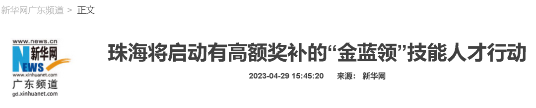 新华网、南方+客户端、触电新闻客户端报道,4月28日,珠海举行产业工人系列政策推进情况发布会。据悉,在今年7月启动的珠海市“金蓝领”技能人才引进行动中,高技能领军人才、杰出人才最高可获30万元工作奖励,高技能人才最高可获3.8万元生活补贴。今年,珠海还将实施“产业新工匠”培育工程,加快构建“产教培”融合、“政企社”协同、“育选用”贯通的工匠型产业工人培育体系。