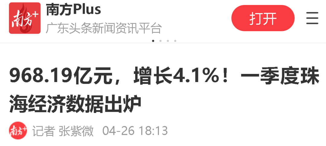 南方+客户端、《羊城晚报》报道,4月26日,珠海统计局公布了2023年一季度珠海经济数据。根据广东省地区生产总值统一核算结果,一季度珠海实现地区生产总值968.19亿元,同比增长4.1%。据介绍,一季度珠海经济运行实现良好开局,但距离完成全年目标任务仍有挑战,全市经济企稳向好的基础仍需巩固。