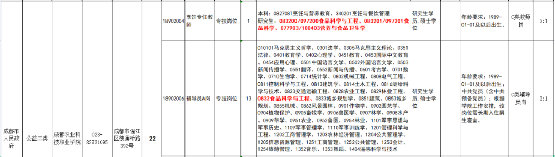 面向全国招聘2024年7月31日前毕业并取得国家承认的学历毕业证、学位证,且符合《2024年下半年成都农业科技职业学院公开招聘22名工作人员岗位表》(以下简称《岗位表》)(附件1)相关岗位条件要求和本公告其他要求的人员。以下为食品及相关专业岗位信息,其余岗位请点击下方阅读原文查看。