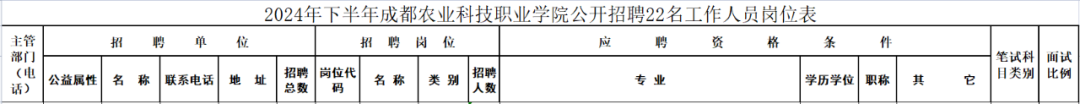 应聘人员报名前应认真阅读本公告以及《2024年下半年成都农业科技职业学院公开招聘22名工作人员岗位表》(附件1)等信息。