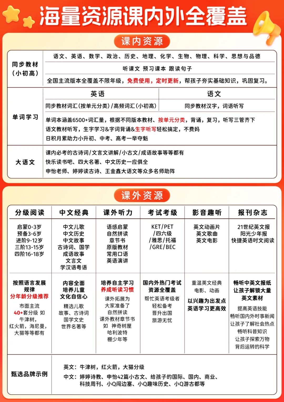 大语文资源,课内资源有小初高必背的古诗词、文言文、快乐读书吧、名著导读,经典的四大名著等应有尽有。