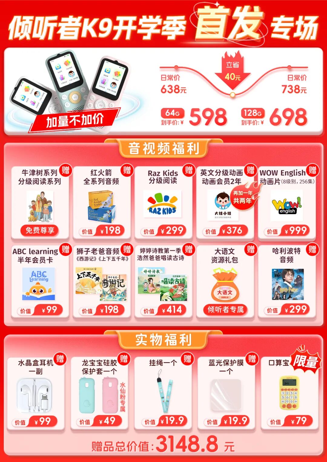 注意,K9是加量不加价,64G还是原来的598元!