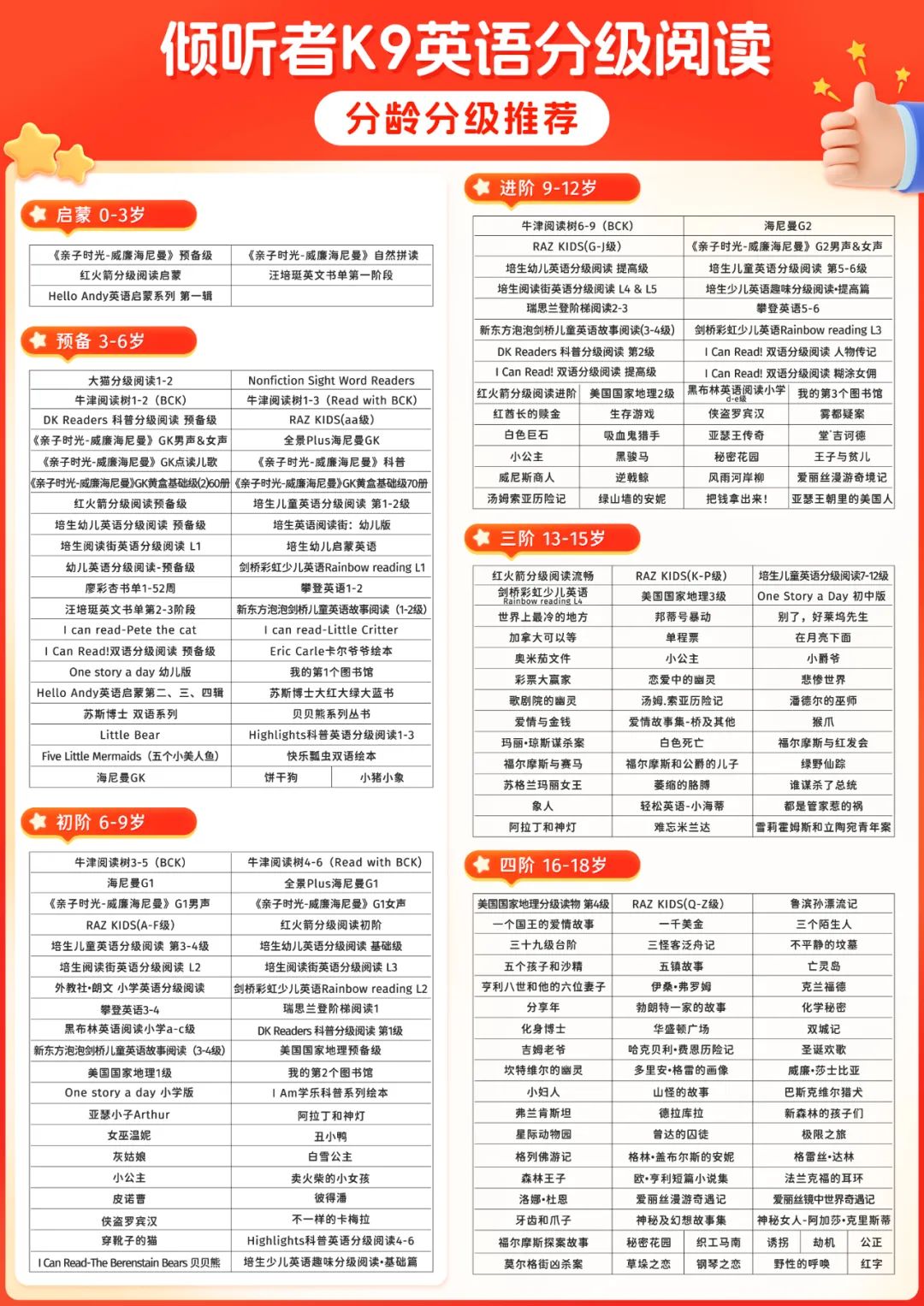 磨耳朵儿歌、英语启蒙、自然拼读、分级读物、桥梁书、初章书、电影音频......全都整整齐分门别类放好了,K9到手就能直接听。