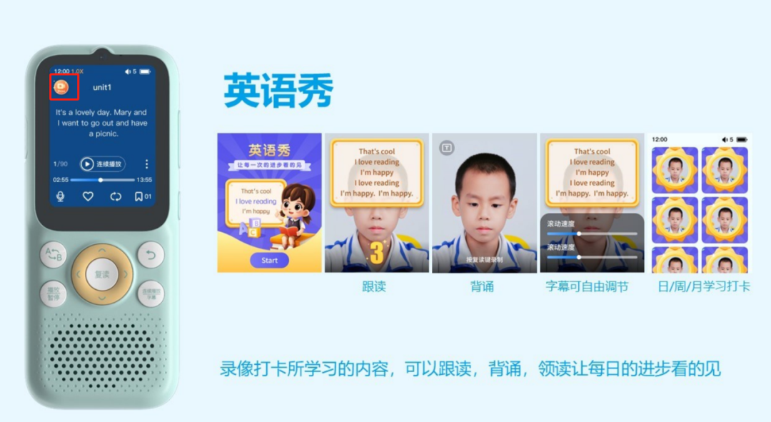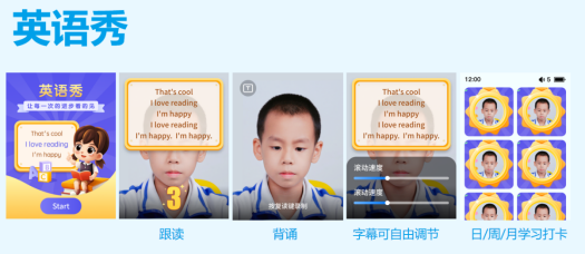 它是针对课内外英语阅读资源进行口语练习,在播放界面,左上角可以进入视频打卡的模式,利用前置摄像头自拍记录,孩子可以跟着字幕录制口语视频。