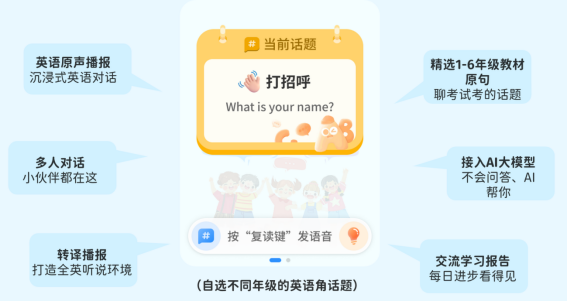 1、新增英语角功能,甄选各年级的教材话题,通过角色扮演,帮助孩子更好地练习教材里的主题对话,鼓励孩子开口说。