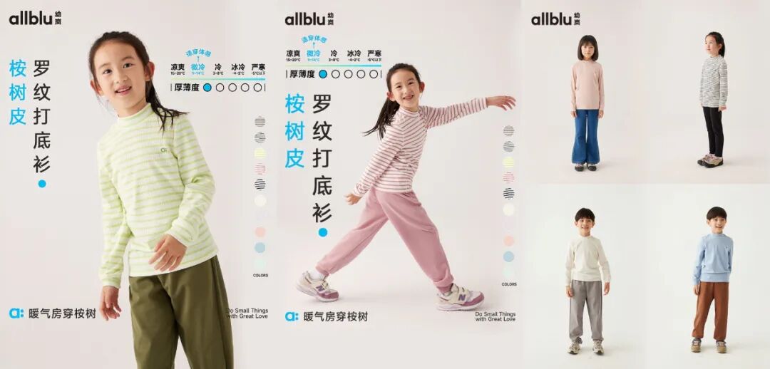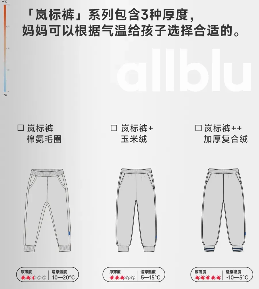 文章开头有提到过岚标裤,幼岚在去年冬天就推出了岚标裤的厚度体系,可以针对不同的温度给孩子选择适合的裤子穿,这点实在是太贴心了。