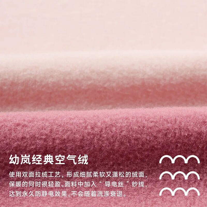 幼岚为了解决这个问题,推出了空气绒外套。她们解决静电的方式和市面上其他品牌不同,其他品牌一般加抗静电助剂,洗几次就没有效果了,但幼岚是国内第一个把导电丝加入绒里的童装品牌,所以这件空气绒是永远不会起静电的,不管怎么洗都一样。非常建议入手试试!