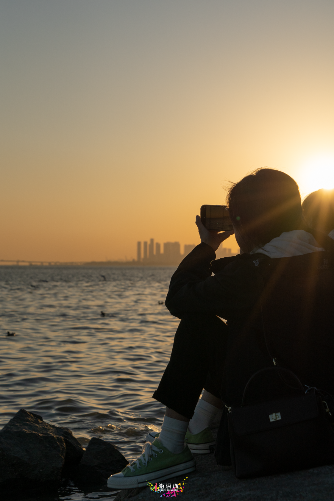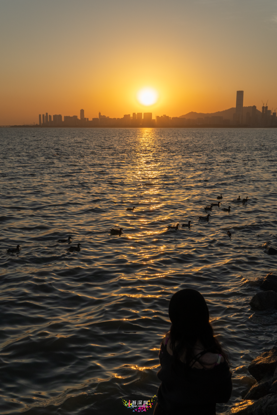 傍晚时分,在深圳湾,和你的搭子踩在礁石上,落日的余晖衬出美丽的剪影,摆上各种情绪的pos,感受最后一丝余光带来的温存。
