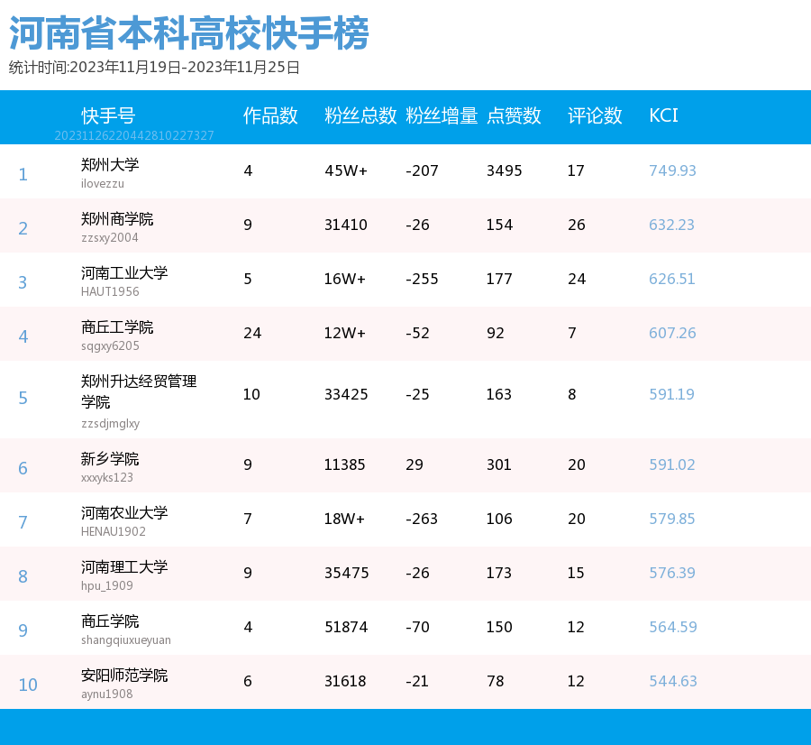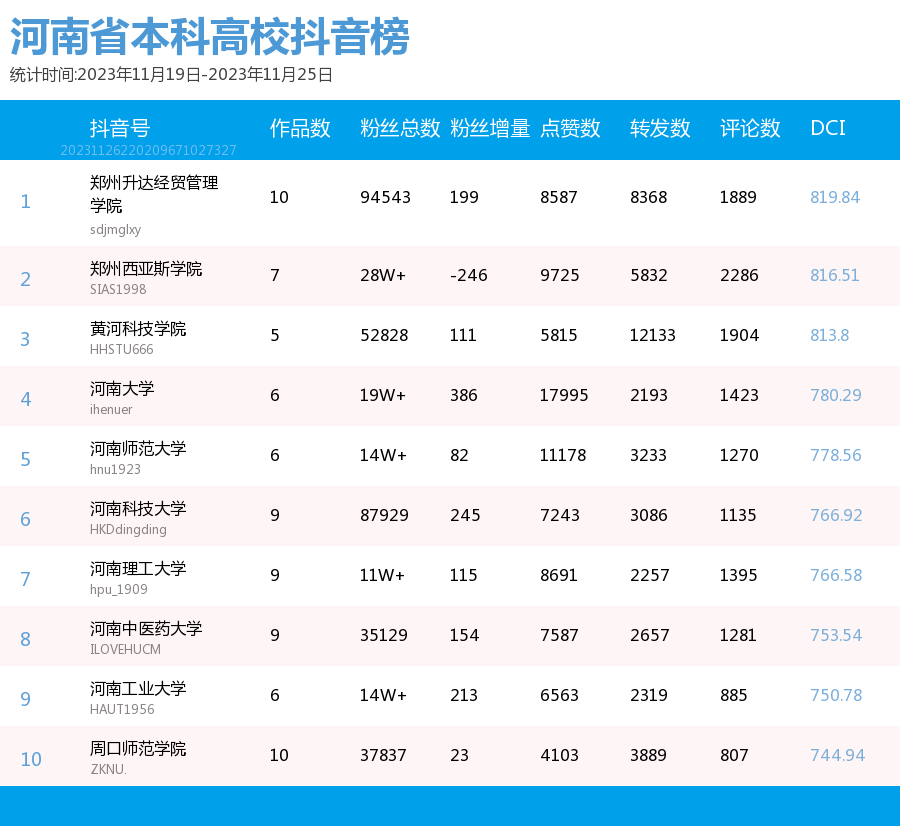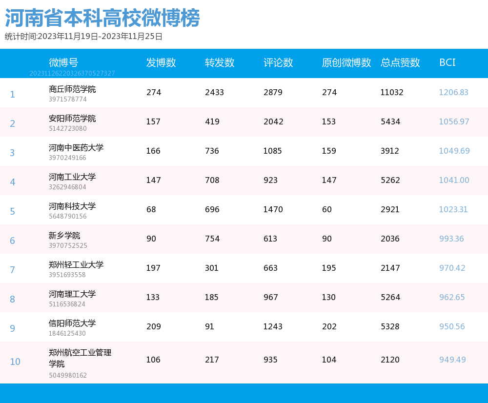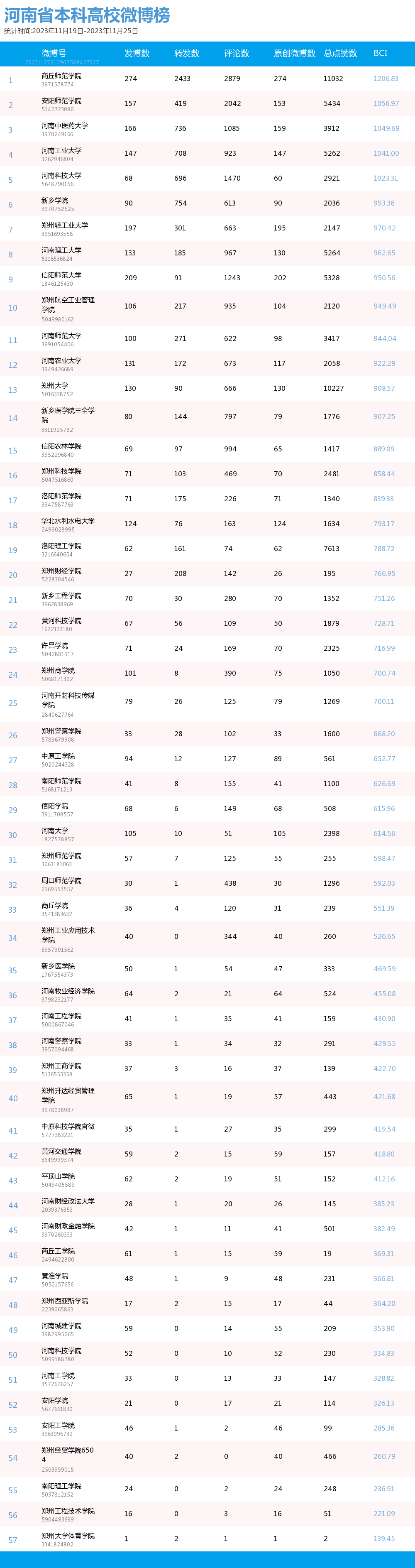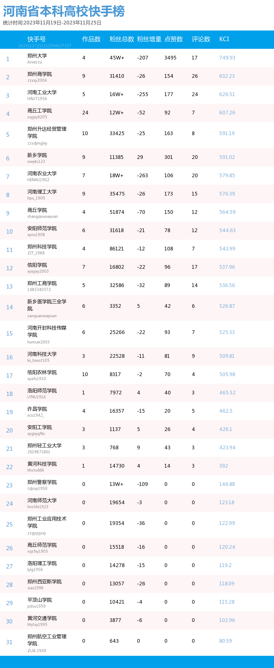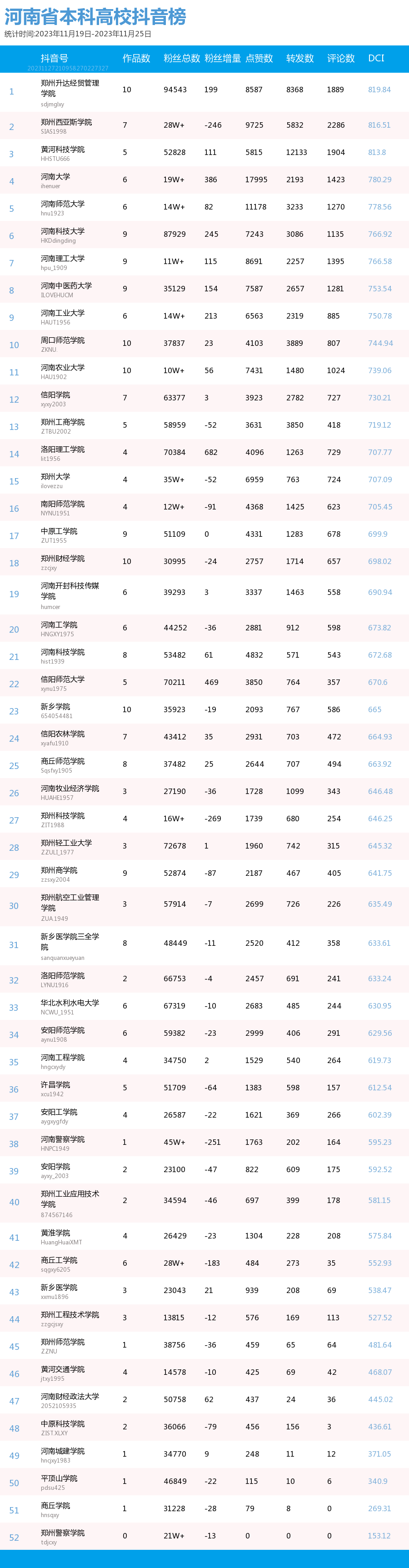 河南省教育新媒体暨舆情研究中心采用第三方平台(清博指数)监测到的数据,按类别对11月19日-11月25日河南省本科院校微信、微博、抖音、快手综合传播力进行排名并整理发布。