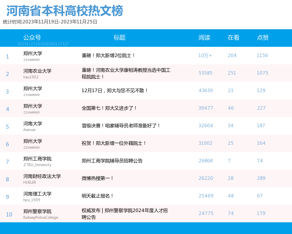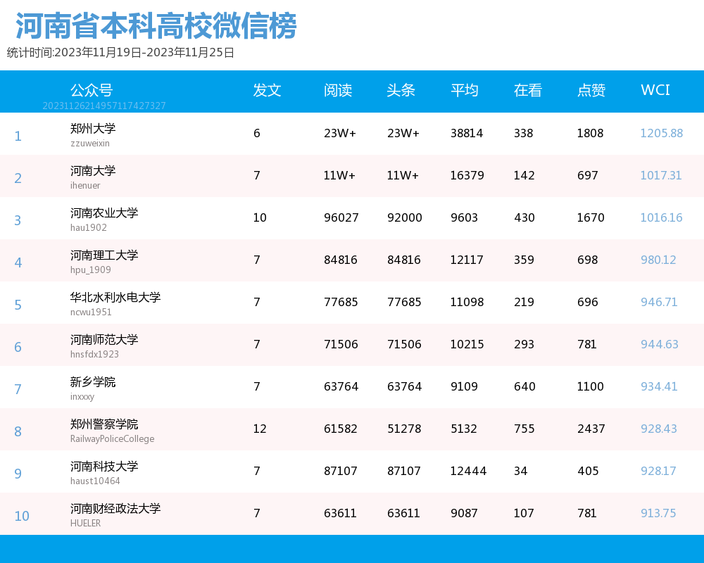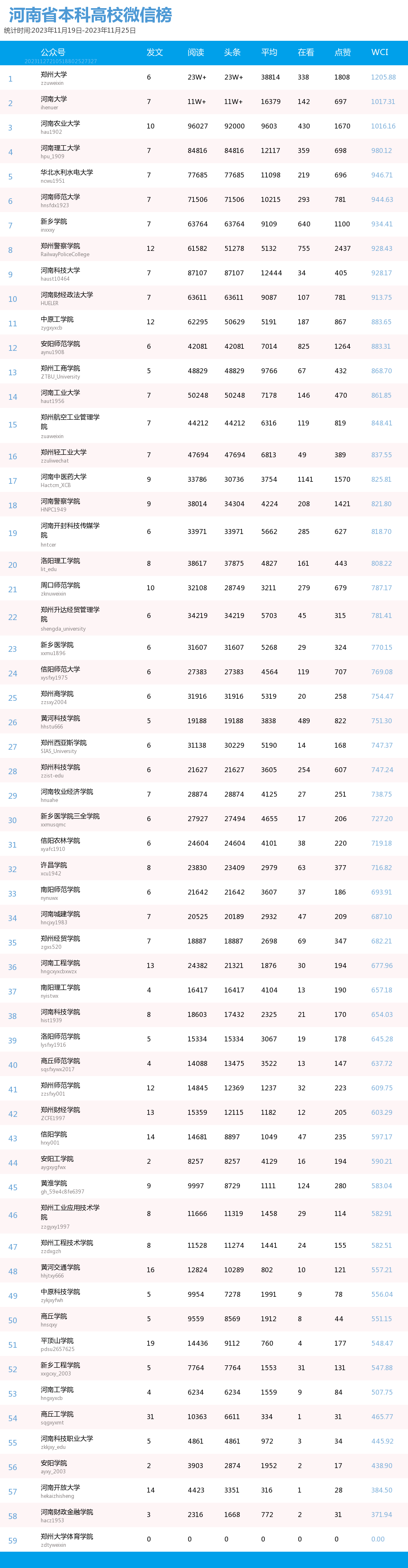 本周本科高校微信榜整体数据较上周而言明显提高,总阅读数与平均阅读数与上周相比也均有大幅提升,充分体现出各大高校本周的推文创作质量的提高和高校同学对推文关注度的上升。其中,郑州大学以1205.88的WCI稳居榜首,河南大学保持上周第二的位置不变,WCI为1017.31,河南农业大学以1016.16的WCI位列第三。其中郑州大学本周的微信总阅读量达到了23W+,表现强势,为其他高校的内容创作提供了借鉴经验,值得学习。令人瞩目的是,郑州大学本周共有4篇微信文章位于热文榜前十,较上周有所增加,仍是热文榜前十的重要力量。本周数据的大幅提升,主要原因在于推文内容的实时性和高质量。希望各大高校继续再接再厉,要求在推文质量不变的情况下实现数量的稳步增加;同时也要结合校园特色,关注热点话题,注重内容的时效性,来更好地提升推文的吸引力和关注度。