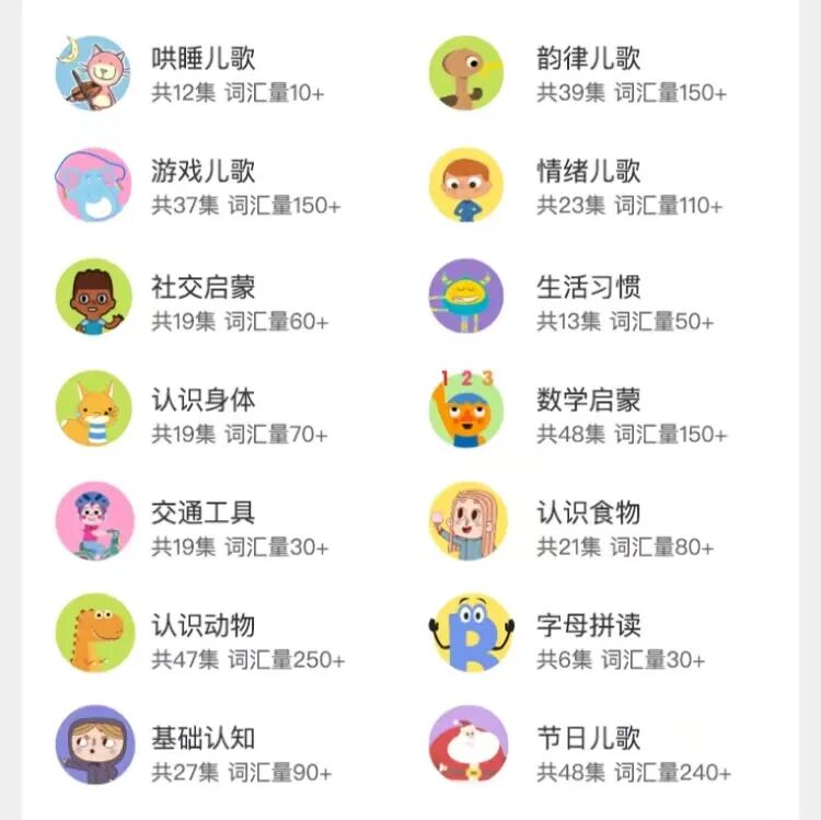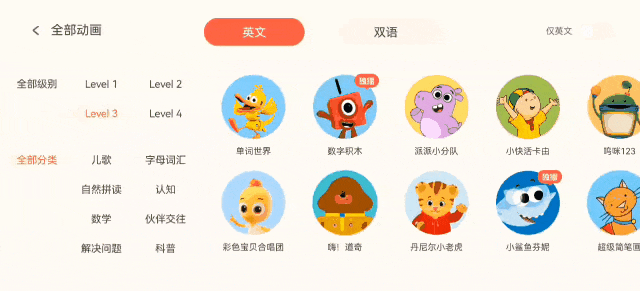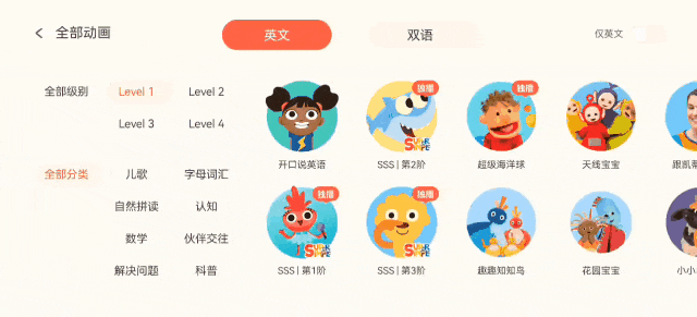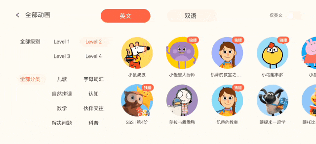 Level2:适合听力词汇400+孩子,从儿歌过渡到慢速动画,继续积累听力词汇,逐渐理解更多日常表达,并且接触字母和自然拼读入门。