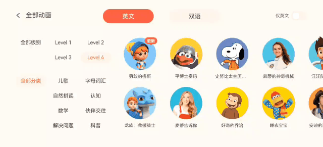 Level4:适合听力词汇1500+孩子,这个级别的节目语速快、情节复杂,会出现更多高级用词和复杂句型,自然拼读也在提上日程。