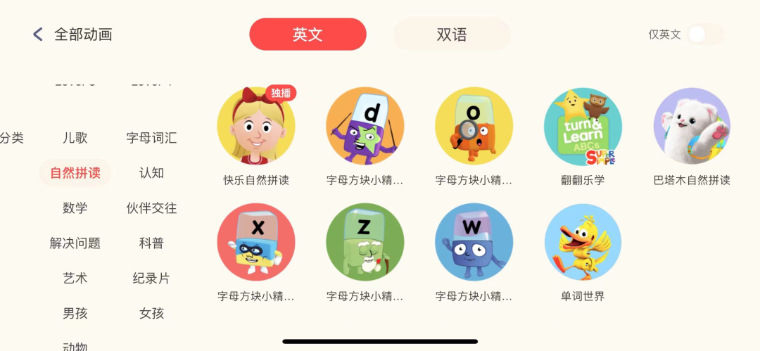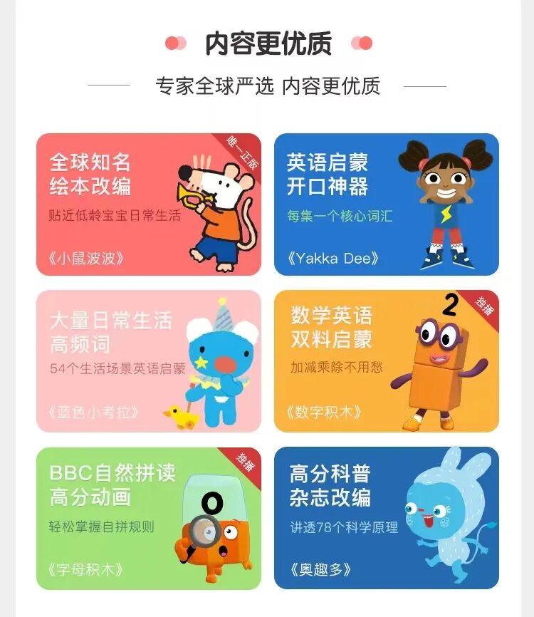 小小优趣目前共引进了10000+适合英语启蒙的儿歌、分级动画、纪录片和100+部亲子电影,全部由专家在全球严选,内容优质没得挑。