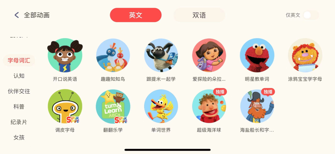小小优趣里面的儿童动画全部正版引进,按照主题和年龄分类,还搭配有台词本,里面的内容定期更新,比如最近新增了剑桥听力词汇,还有平博士密码、Maddie's Do You Know、Word World等诸多英文动画。