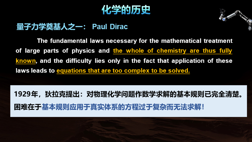 量子力学的奠基人之一保罗·狄拉克(Paul Dirac),在1929年的时候提出:对物理化学问题作数学求解的基本规则已完全清楚,困难在于基本规则应用于真实体系的方程过于复杂而无法求解!意思是,基本原理是清楚的,但是具体的结果是永远也知道不了的,因为解不了这样复杂的方程。 后来,计算机的发展使得人类可以开始解更复杂的方程。1952年时候的计算机叫手摇计算机,算一个氮分子要花两年的时间。所以有人断言把世界上的纸全部用完,也算不了一个铁原子。当时瑞典的一个量子化学的奠基人佩尔-奥洛夫·勒夫丁(Per-Olov L?wdin)说:“如果你聪明,你就不需要用计算机,如果你不聪明,你也不知道怎么用计算机。” 现在人工智能也是一样的。化学的基本问题在理解层面上有了巨大的进步,但对于真正去做化学的人这是不够的。我们虽然超越了狄拉克的理论,但实际上并没有解决很多化学的问题。