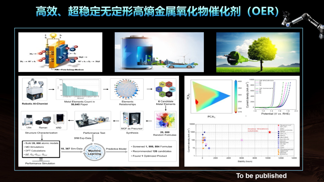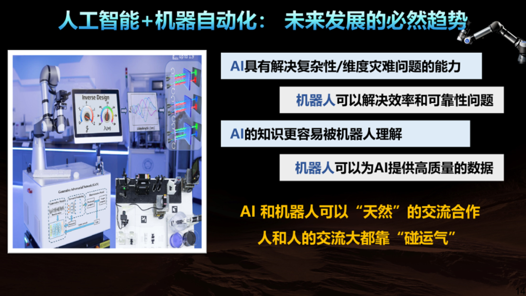 情绪波动产生的数据的低通量的问题,很多欧美的实验室也已经通过采用机器代替人来解决了。但这种方式也存有问题,因为它本质上是个自动化的机器,并不能像人一样的可以思考。 人工智能具有解决复杂性和维度灾难的能力,机器人可以解决效率和可靠性的问题,因此人工智能加机器自动化发展是个必然趋势。同时AI的知识是更容易被机器理解的,机器人也可以为AI提供高质量数据,AI和机器可以天然地交流合作,相对于人类之间的低效交流,优势明显。构建人工智能化学家,首先需要它有学习能力,学习就要有知识积累、逻辑分析和动手能力。其次它要能够走通人类科学家的工作路线。机器人“小来”可以在阅读文献的同时指挥计算机建立模型计算、安排机器人做实验——整体的流程它都能完成。“小来”是一套完整的可拓展的系统,新的仪器能够做到即插即用,所有程序都能够做到兼容,所以在未来潜力是非常大的,能够颠覆性地改变整个化学的研究的范式。以高熵金属电催化剂的研究为例,高熵就是要5种以上金属混在一起,“调配”出一种最好的催化剂。但是因为有5种金属,高熵的形态很多,还有各种各样的结构,对机器的合成的技术要求非常高,因而机器人的技术操作能力也要大幅提升。我们预设了两个目标:一是在未知场景下利用未知物质创制催化剂;二是选取最优金属元素创制高性能催化剂。“小来”用两周的时间完成了数以百万计的陨石的配方筛选,创制出了高效产氧的催化剂材料。这项工作需要一个人花上千年才能完成。整个研究工作产生了很强的新闻效应,人类终于向定居火星迈出了重要一步,可以通过机器做好所有前期准备,甚至是产生氧气,《Nature》也专门发了视频来介绍这个成果。nceid="1565210990423246396" data-type="video" data-mediatype="undefined" data-authiconurl="https://dldir1v6.qq.com/weixin/checkresupdate/icons_filled_channels_authentication_enterprise_a2658032368245639e666fb11533a600.png" data-from="new" data-width="1920" data-height="1080" data-id="export/UzFfAgtgekIEAQAAAAAANW051fm4xAAAAAstQy6ubaLX4KHWvLEZgBPE9oEgQTFaWqKFzNPgMItFkfVcq-FRKOl0ZlDVi1ND" data-isdisabled="0" data-errortips="">除了制作氧气,中国天津生物工业研究所几年前还发表过二氧化碳加上水就能够直接通过催化反应制造淀粉的研究工作。利用这些成果,我们可以到火星上产生氧气、食物和各种各样的东西,所以未来还是非常有用的。